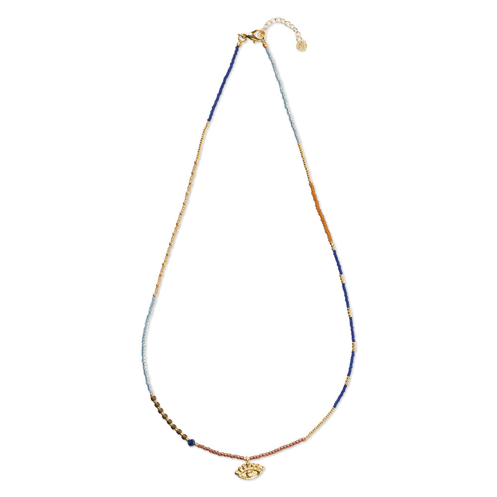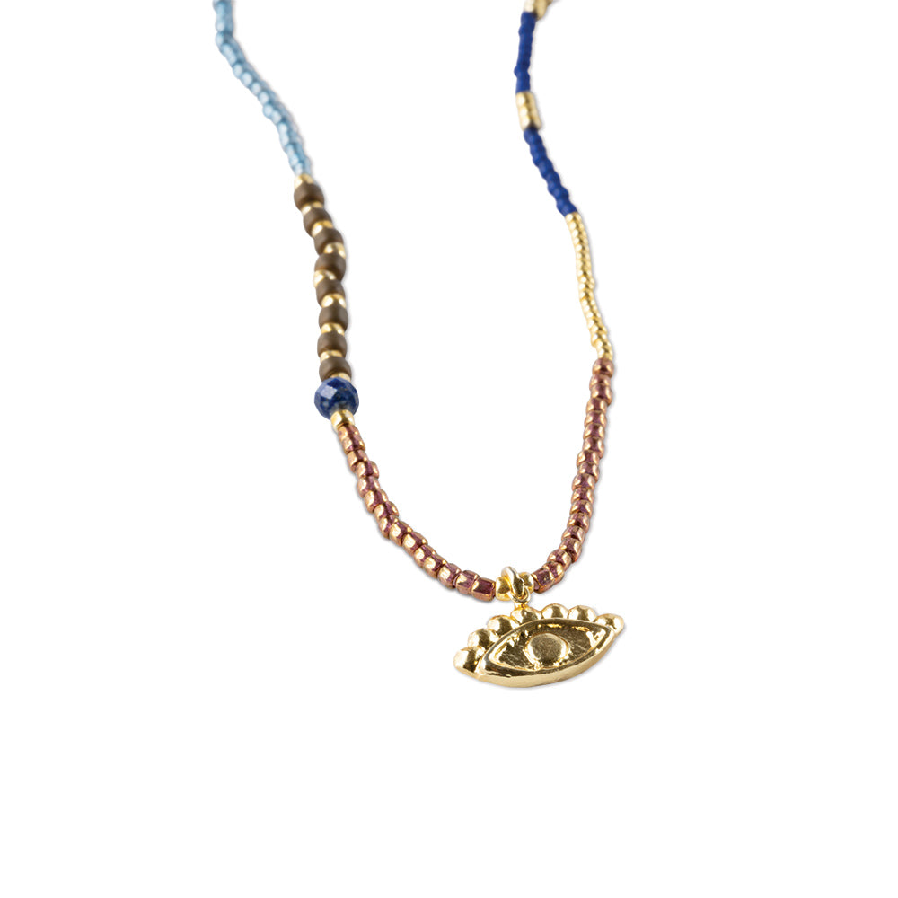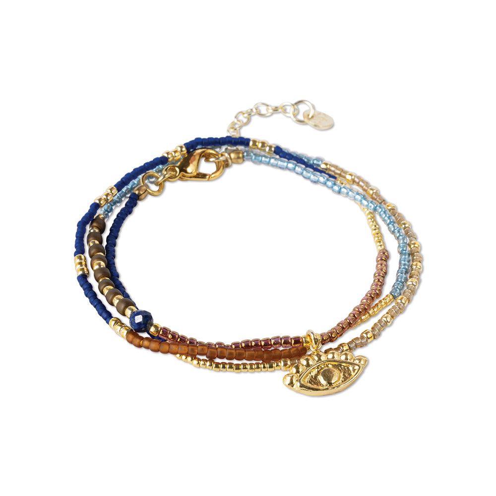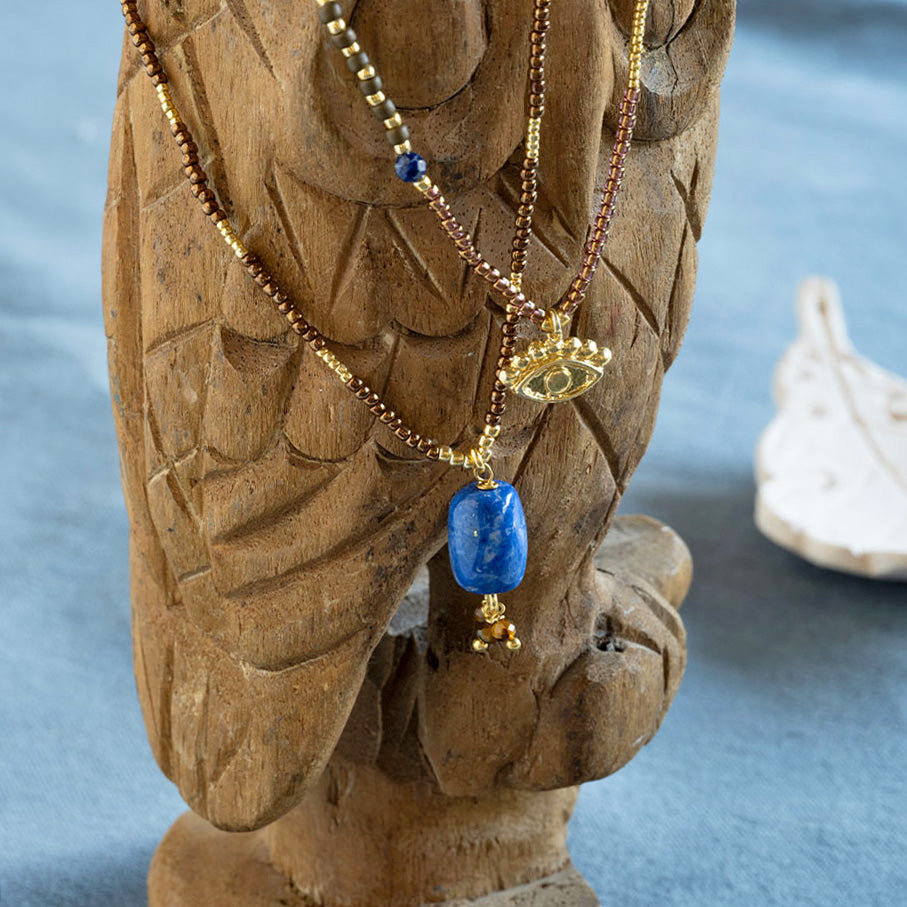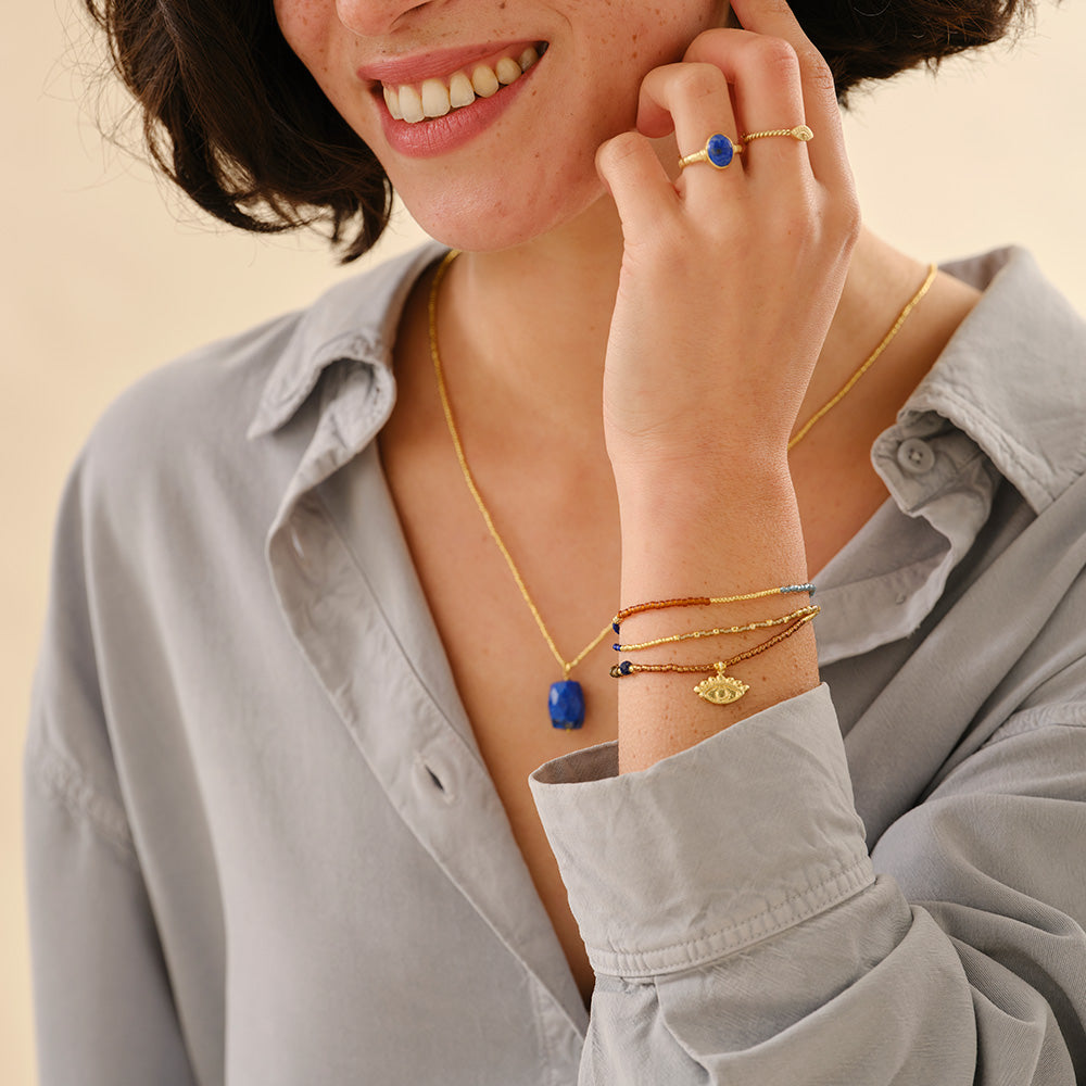Lapislazuli war Cleopatras Lieblingsedelstein. Wegen seines spektakulären Blaus, aber auch wegen seiner Symbolik. Weisheit und Verbindung. In der Adventurous Lapislazuli Halskette vereinen sich Weisheit und Verbundenheit mit dem allsehenden Auge, einem Schutzsymbol. Genau das Richtige für Powerfrauen! * Doppelte Freude: Das Design der Halskette kann auch als dreifach gewickeltes Armband getragen werden.