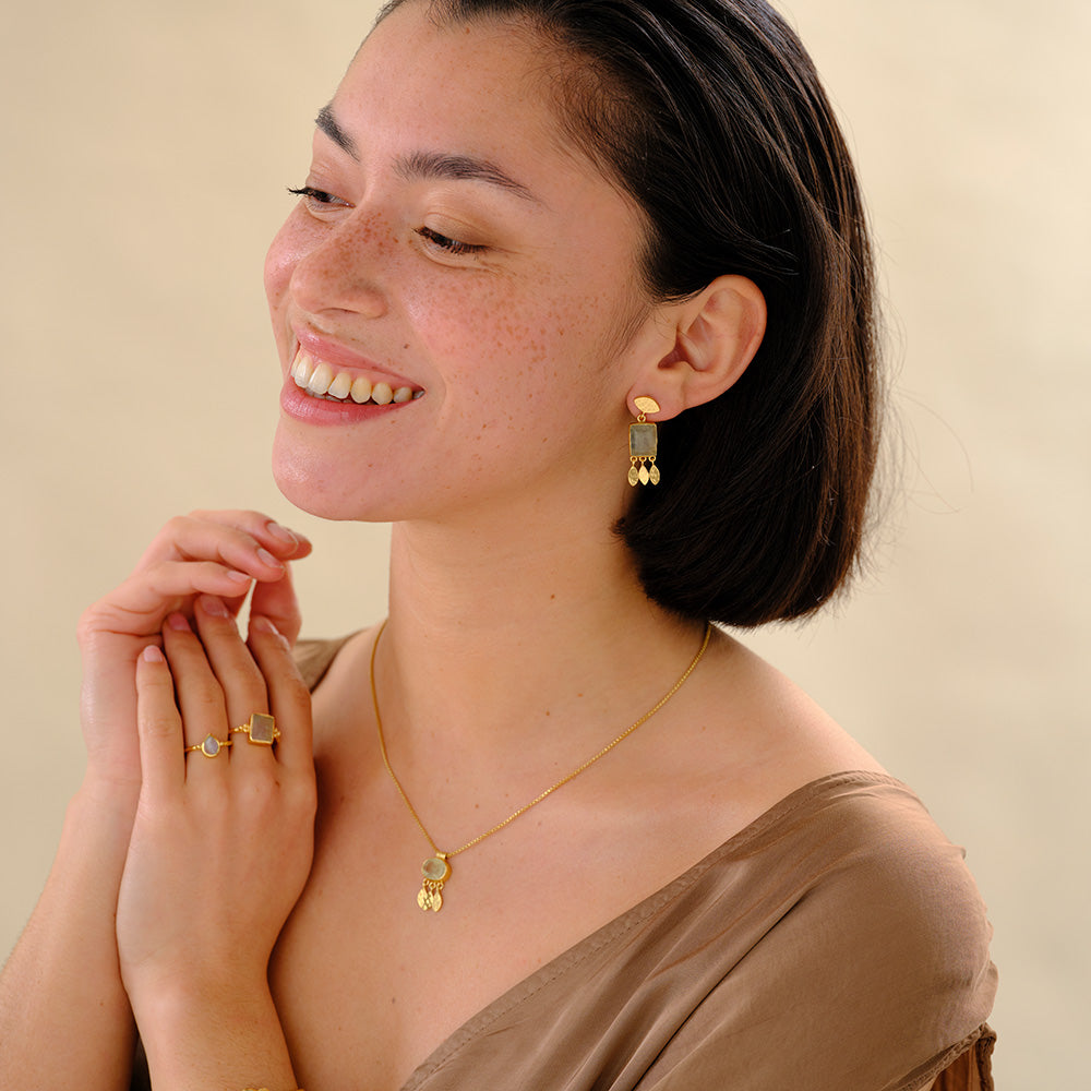 Unsere Affectionate Prehnit Ohrringe sind in einem kühnen und dennoch zeitlosen Stil gestaltet und werden dir viele Jahre lang Freude bereiten. Die milchig-grünen Prehnit-Edelsteine, die für Freundlichkeit, Ruhe und inneren Frieden stehen, sind in einer klassischen rechteckigen Form geschliffen. In Jaipur, Indiens einziger Hauptstadt der Edelsteine. Nutze jede Gelegenheit, diese zeitlosen Schätze zu tragen.