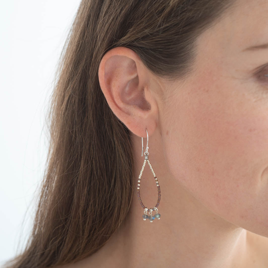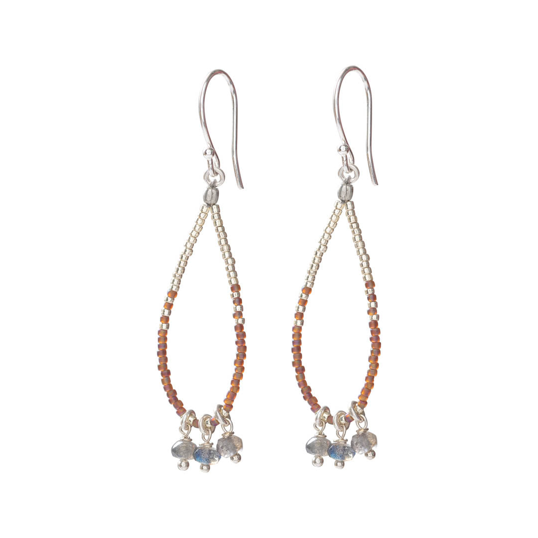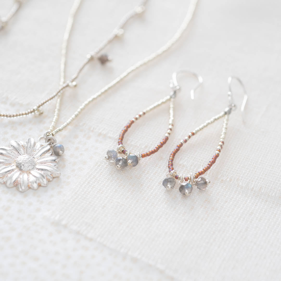 Entdecke die silberfarbigen Becoming Labradorit Ohrringe von A Beautiful Story. Die Ohrringe sind aus versilbertem Messing und Glasperlen gefertigt. Sie sind mit drei kleinen facettierten Labradorit-Edelsteinen versehen. Die Ohrringe sind auf Metalldraht gefädelt, um die schöne Form der Ohrringe beizubehalten. Die Länge beträgt 7 cm.