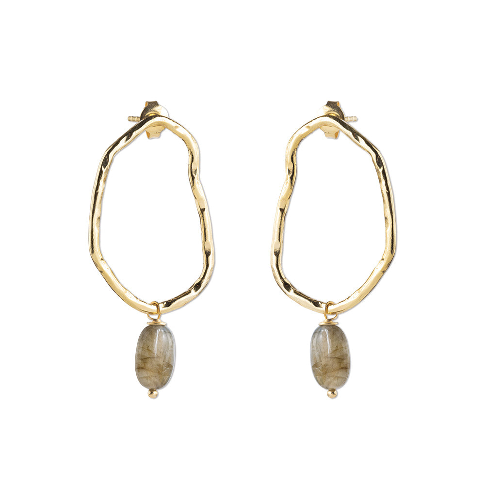 Eyecatcher wird zu Earcatcher. Die Stärke unserer Bravery Labradorit Ohrringe liegt in ihrer Schlichtheit. Das subtile vergoldete Design wird durch einen polierten Labradorit-Anhänger abgerundet, der Intuition und Erfolg symbolisiert. Wir sind ganz Ohr.