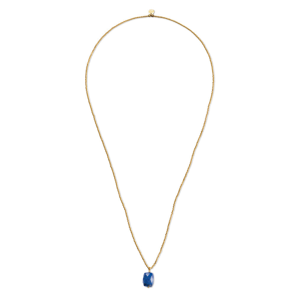 Wenn es gut genug für Cleopatra war... Lapislazuli war Cleopatras Lieblingsedelstein. Wegen seines spektakulären Blaus, aber auch wegen seiner Symbolik. Weisheit und Verbindung - das Rezept für ewige Freundschaft. Das macht unsere Calm Lapislazuli Halskette zu einem begehrten Must-have. Im typischen Cleopatra-Stil aus vergoldetem Messing mit einem leuchtend blauen, facettierten Edelstein.
