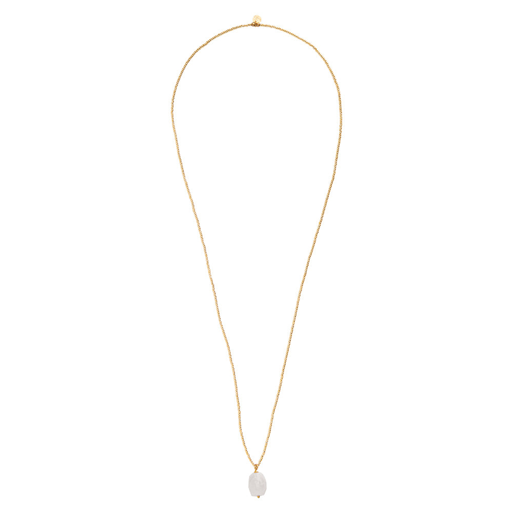 Entdecke die goldfarbige Calm Mondstein Halskette von A Beautiful Story. Diese wunderschöne Halskette ist einer unserer Klassiker. Die handgefertigte Halskette besteht aus Glasperlen und vergoldetem Messing und ist mit einem großen Mondstein versehen. Mit einer Länge von 62 cm passt die Halskette einfach jedem.