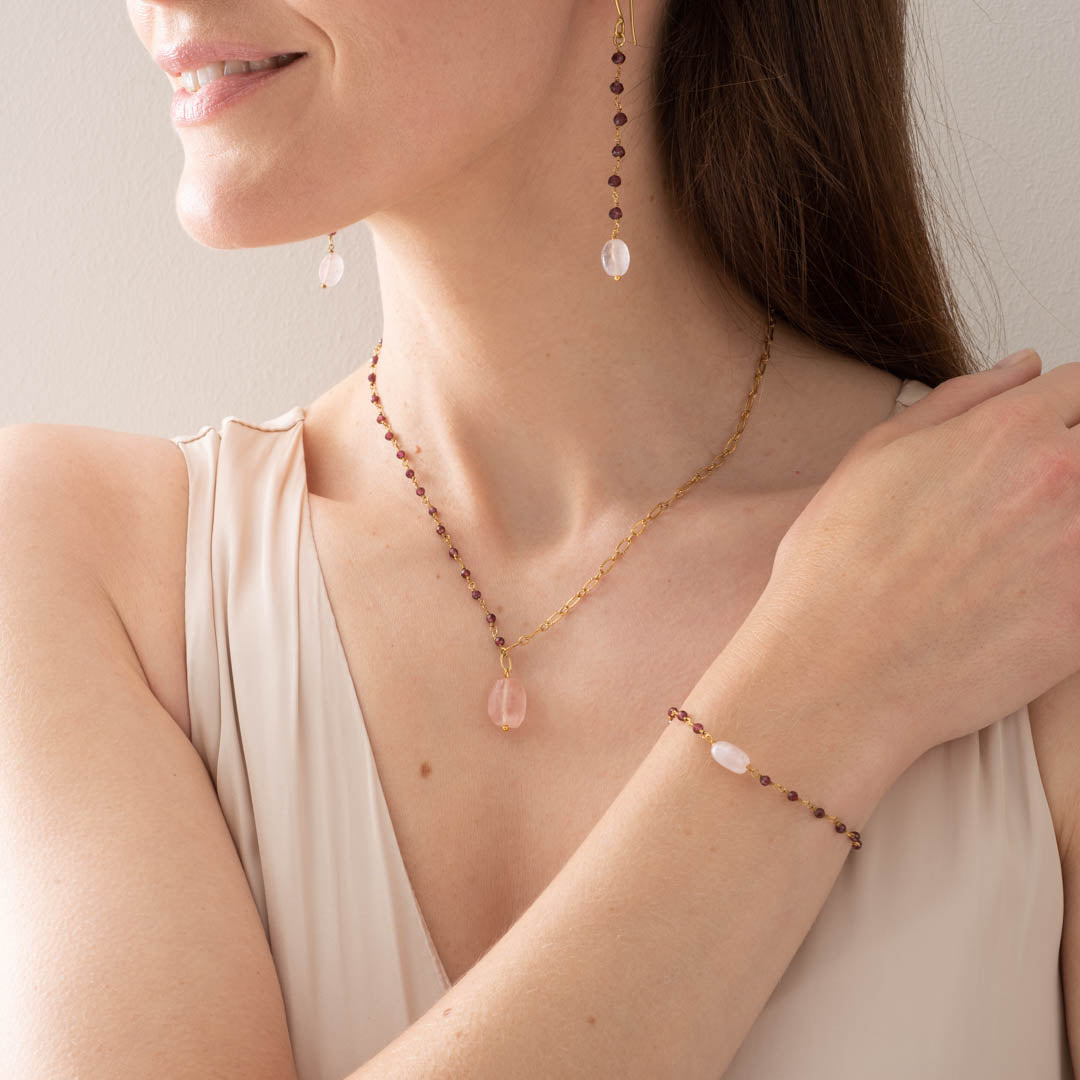 Diese vergoldete Kette besteht zur Hälfte aus einer Rosenkranzkette mit facettierten Granat Edelsteinen und einer Gliederkette, daran ist ein großer facettierter Rosenquarz Edelsteinanhänger befestigt. Die Kette ist durch ein Verlängerungskettchen größenverstellbar.