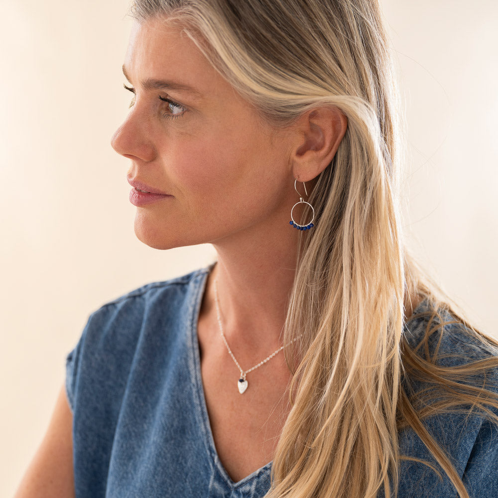 Das sind die versilberten Compassion Lapislazuli-Ohrringe. Diese Ohrringe sind aus versilbertem Messing handgefertigt und mit kleinen Lapislazuli-Edelsteinen verziert. Die Ohrringe haben eine Länge von 3,5 cm. Lapislazuli ist der Stein der Verbindung. Lapislazuli schenkt dir den Mut zu sagen, was dir auf dem Herzen liegt. Durch diese Haltung und Aufrichtigkeit lernst du andere Menschen und Seelenverwandte kennen. Freundschaft in ihrer schönsten Form.