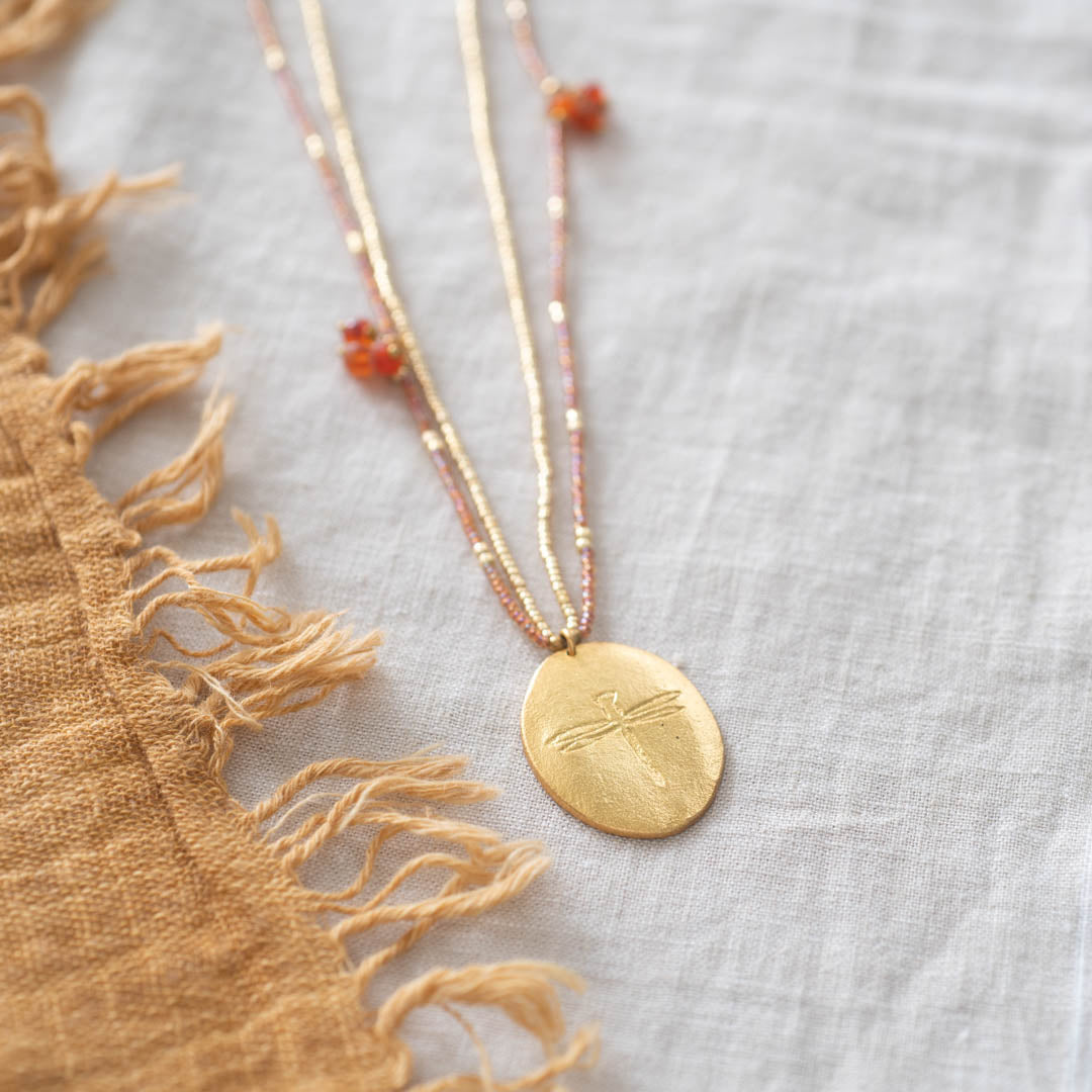 Die goldfarbige Courage Karneol Halskette von A Beautiful Story ist aus Glasperlen gefertigt und mit kleinen Karneol-Edelsteinen, einem vergoldeten Libellen-Anhänger und einem vergoldeten Verschluss versehen. Die Länge der Halskette beträgt 80 cm.