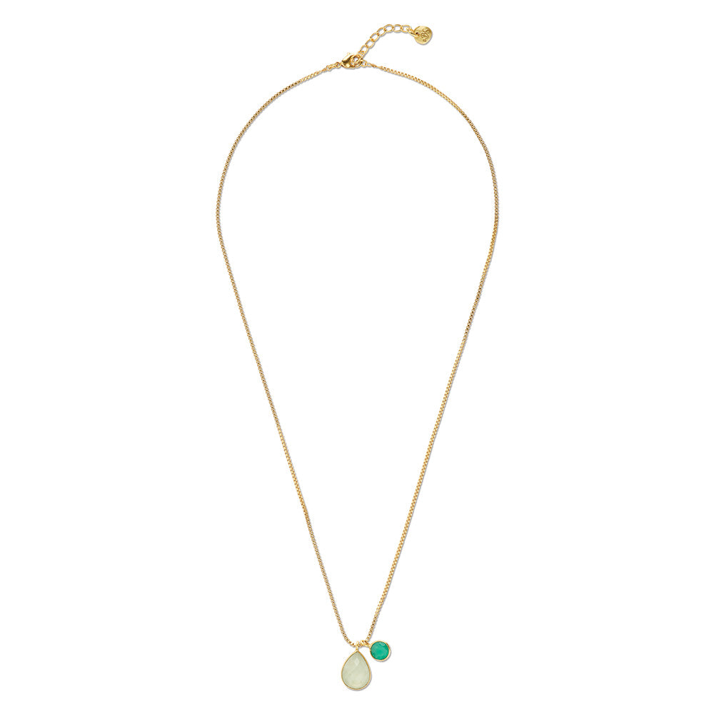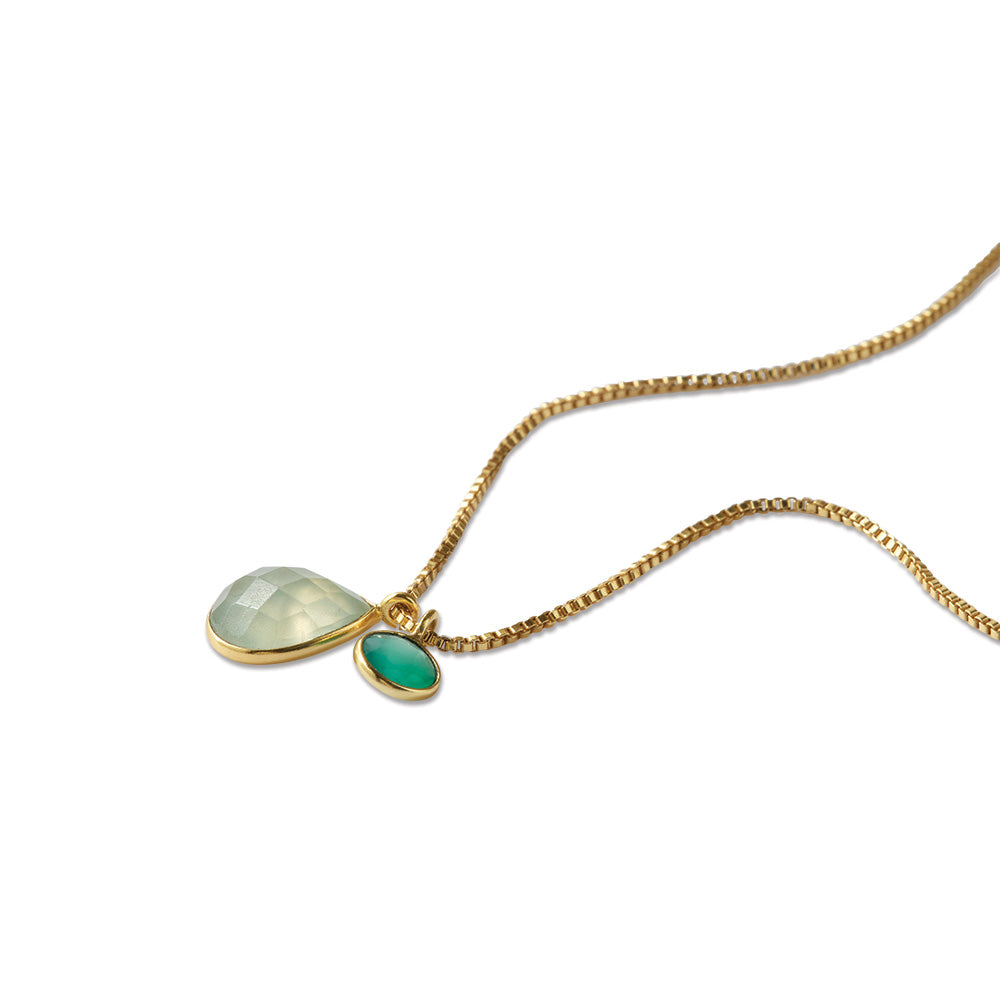 Je raffinierter, desto zeitloser. In Bezug auf Qualität und Design ist die Devote Prehnit Grüner Onyx Halskette ein wahrhaft zeitloser Schatz. Die zarte vergoldete Halskette verfügt über einen tropfenförmigen Prehnit und einen kleinen runden grünen Onyx, die sorgfältig facettiert sind. Luxuriös und symbolträchtig, für viele Jahre konzipiert. Sorgfältig handgefertigt in Jaipur, Indiens einziger Hauptstadt der Edelsteine.