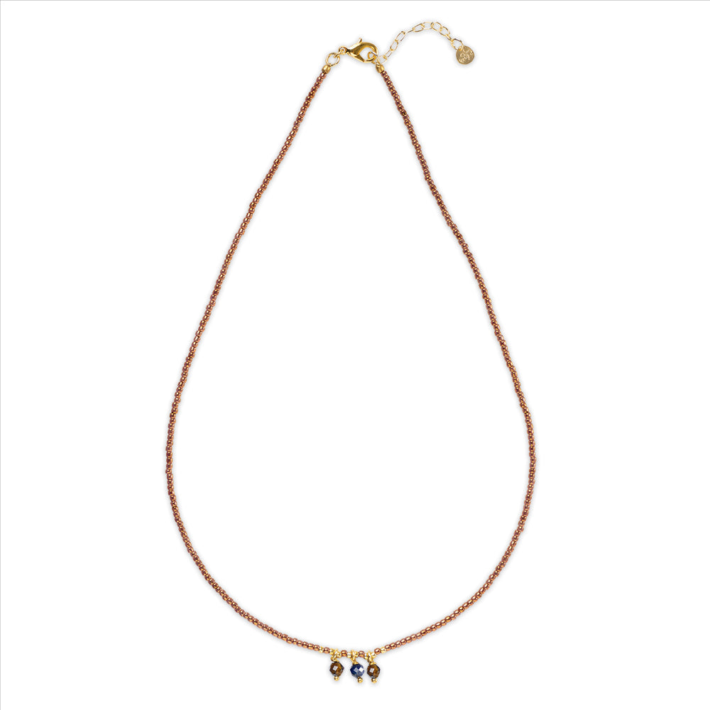 Lapislazuli und Tigerauge, Mut und Weisheit, auffälliges Blau und goldenes Braun - die Empathy Tigerauge Lapislazuli Halskette dreht sich ganz um Balance. Drei kleine facettierte Edelsteine spielen verspielt an einer zarten Glasperlenkette. Eine schöne Ergänzung zu deinen sorgfältig ausgewählten fair hergestellten Favoriten.