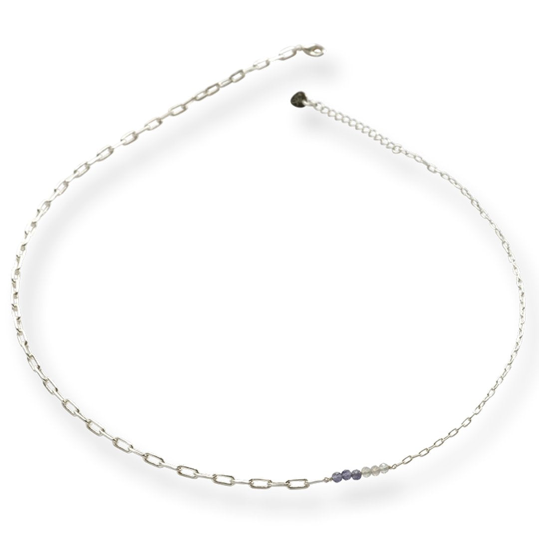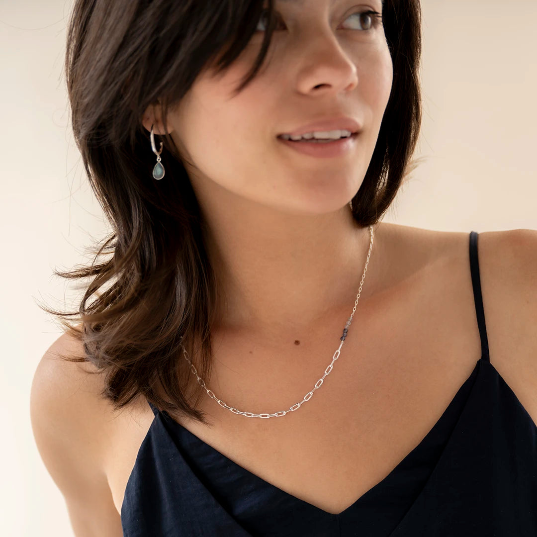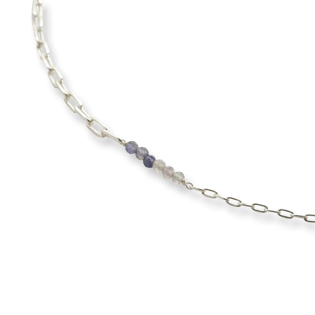 Entdecke die Encourage Labradorit Iolith Halskette aus der Timeless Treasures Kollektion von A Beautiful Story. Diese versilberte Halskette hat sechs kleine facettierte Edelsteinperlen aus Labradorit und Iolith. Handgefertigt in Jaipur, Indien, ist diese Halskette mehr als nur ein Accessoire – sie ist ein Glücksbringer, der dich auf deiner Reise begleitet.