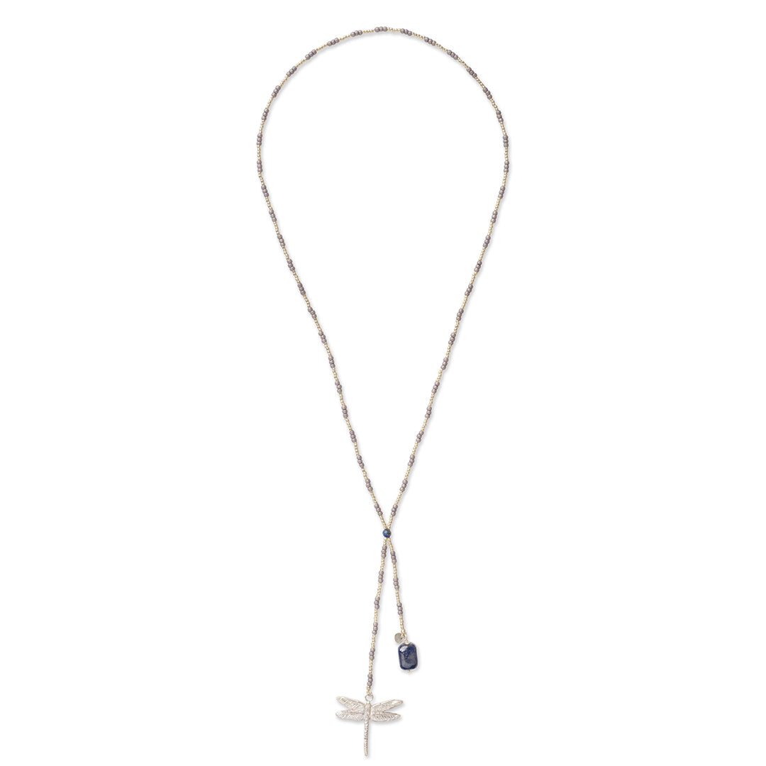 Die silberfarbige Entire Lapislazuli Halskette von A Beautiful Story ist eine lange Halskette mit einer Länge von 80 cm. Die Halskette ist handgefertigt mit Lila- und Silberglasperlen, kombiniert mit einem Lapislazuli Edelstein und einem großen versilberten Libellenanhänger. Lapislazuli verbindet dich von Herzen. Die Libelle symbolisiert Veränderung, Abenteuer und Einsicht.