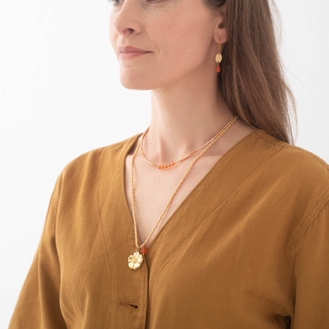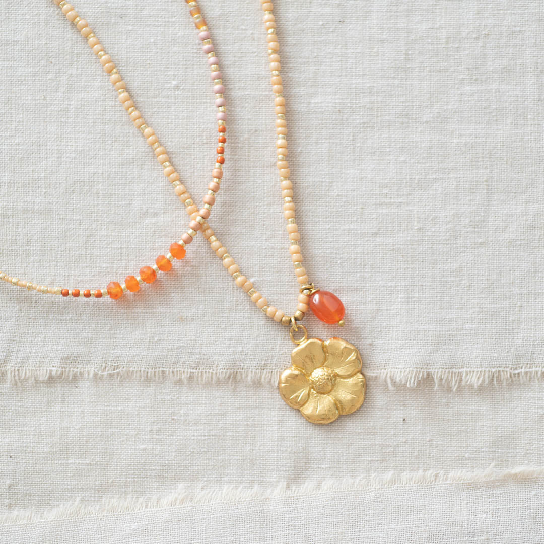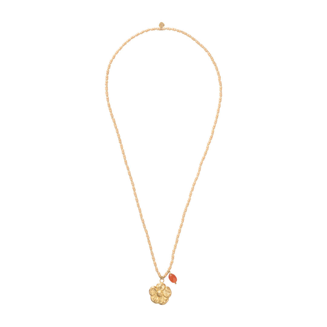 Die goldfarbige Fantasy Karneol Halskette von A Beautiful Story besteht aus einer Mischung von Glasperlen. Sie ist mit einem kleinen Karneol-Edelstein und einem Anhänger mit Mohnblumen-Symbol versehen. Die Länge beträgt 60 cm.