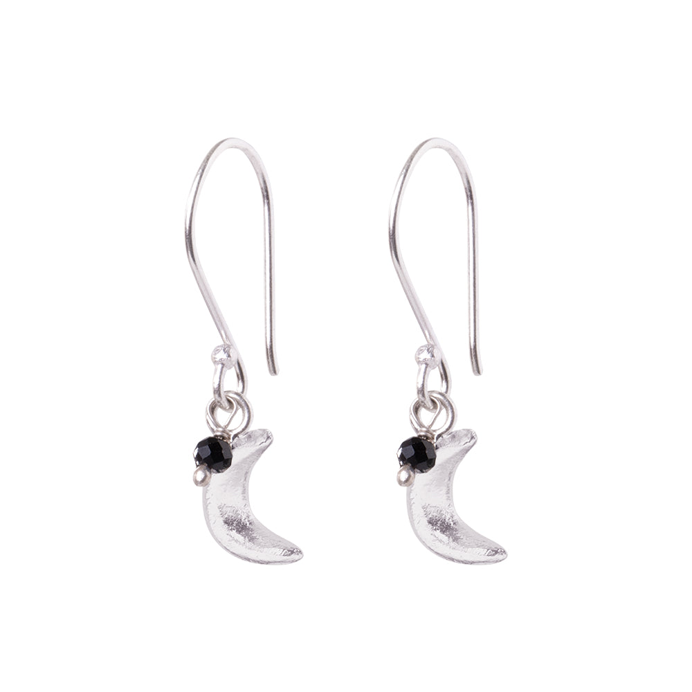 Die versilberten Generous schwarzer Onyx Ohrringe sind wunderschöne Hakenohrringe aus versilbertem Messing, die mit einem kleinen schwarzen Onyx-Edelstein und einem Mond-Symbol versehen sind. Die Ohrringe haben eine Länge von 3 cm und können zu jedem Anlass getragen werden.