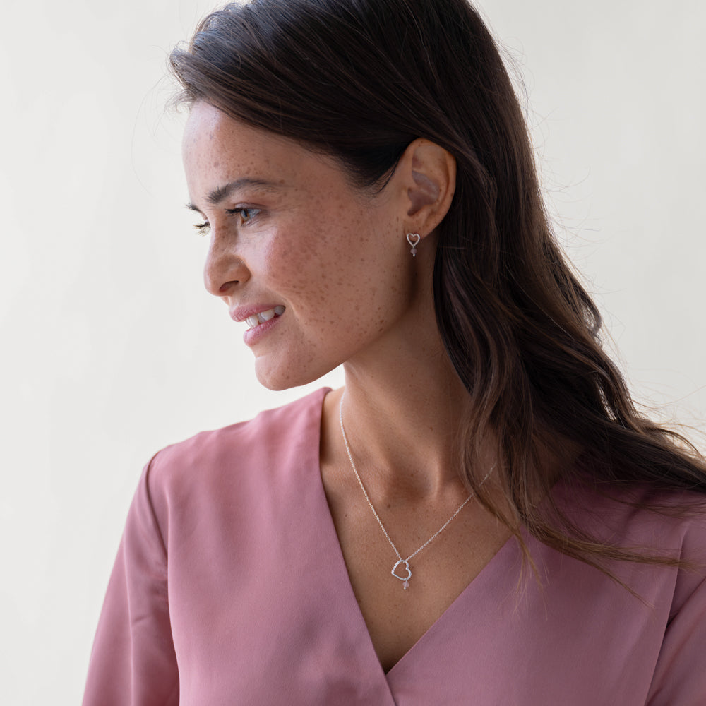 Die Ohrringe und die Halskette vereinen versilbertes Messing und einen Rosenquarz-Edelstein und sind mit einem Herz-Symbol versehen. Die Halskette hat eine verstellbare Länge von 43-46 cm und die Ohrringe haben eine Länge von 2 cm.