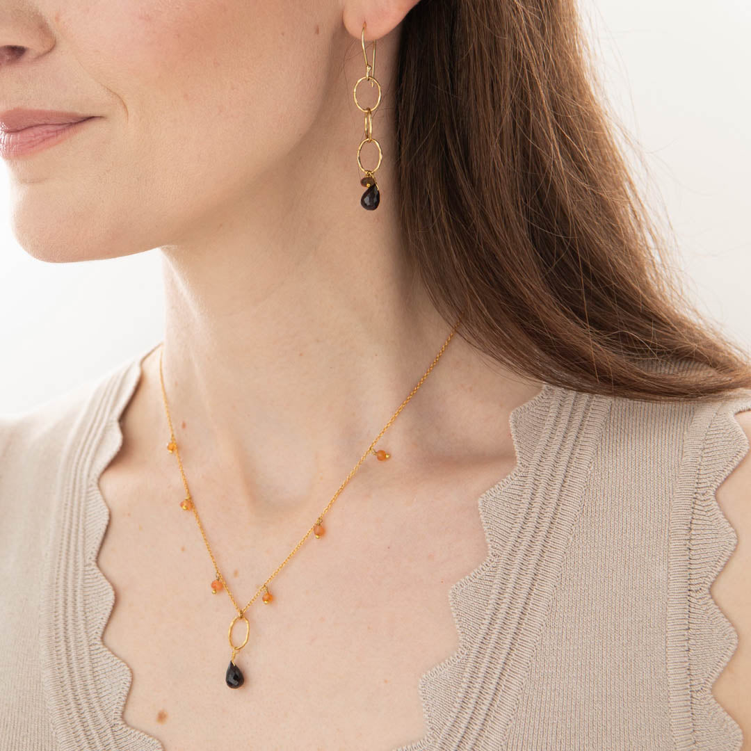 Diese Glowing-Granat Mix Gold-Ohrringe von A Beautiful Story sind aus goldfarbenem Messing gefertigt. Diese Hakenohrringe bestehen aus 3 runden Creolen mit einem Edelstein-Anhänger aus Granat. Die Länge der Ohrringe beträgt 9 cm.