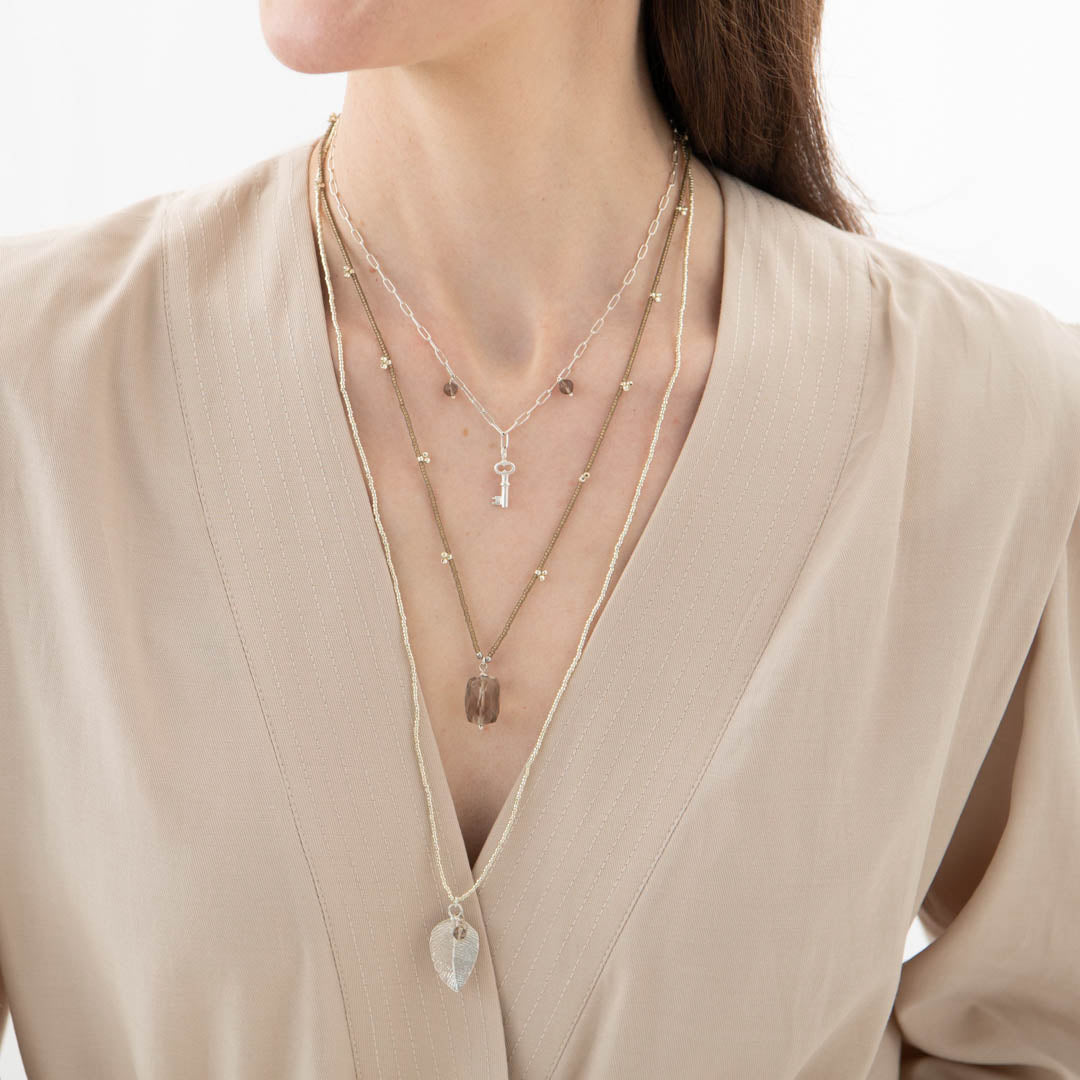 Diese Goodness-Rauchquarz Gold-Halskette von A Beautiful Story ist goldfarben und besteht aus vergoldetem Messing. Die Halskette trägt zwei kleine Rauchquarz-Edelsteine und ein Schlüssel-Symbol. Der Verschluss ist vergoldet und die Länge der Halskette ist verstellbar von 43-46 cm.