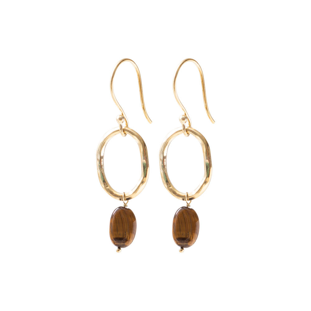 Die vergoldeten Graceful Tigerauge Ohrringe von A Beautiful Story sind handgefertigte Hakenohrringe aus vergoldetem Messing mit einem großen, ovalen Ring und einem Tigerauge-Edelstein. Die Länge der Ohrringe beträgt 5 cm.