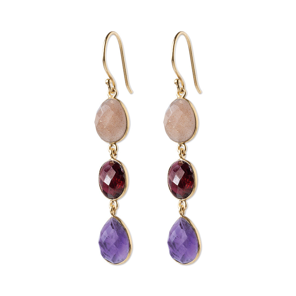 Dreifacher Luxus und zeitloser Stil. Das bringen unsere Granted Pfirsich-Mondstein Granat Amethyst Ohrringe auf deinen Schminktisch. Zusammen tragen die drei facettierten Edelsteine eine Menge wertvoller Symbolik in sich. Genauso wie du von nun an. Sorgfältig handgefertigt in Jaipur, Indiens Hauptstadt der Edelsteine.