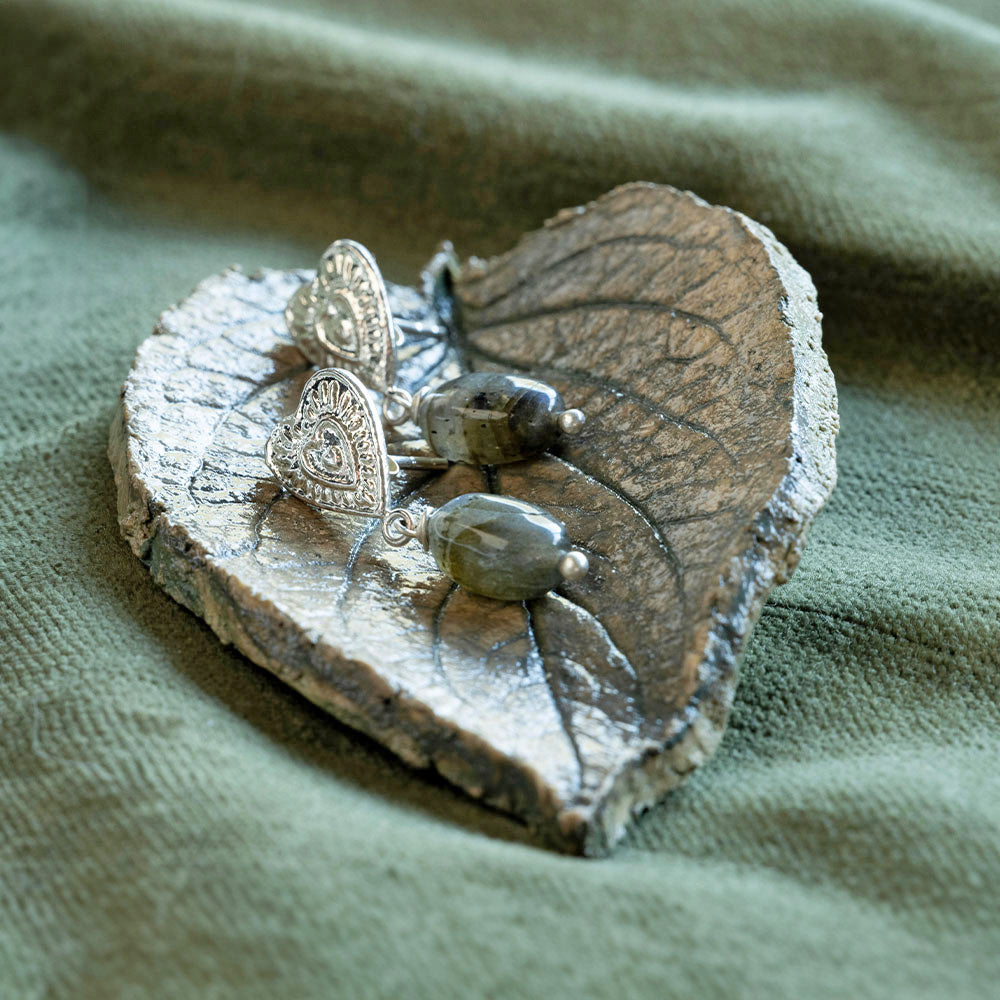 Echte Trendjäger entdecken unsere Heavenly Labradorit Ohrringe sofort. Die vintage-inspirierten Herzstecker bringen deinen Look auf den neuesten Stand - die polierten Labradorit-Edelsteine setzen das perfekte Finish.