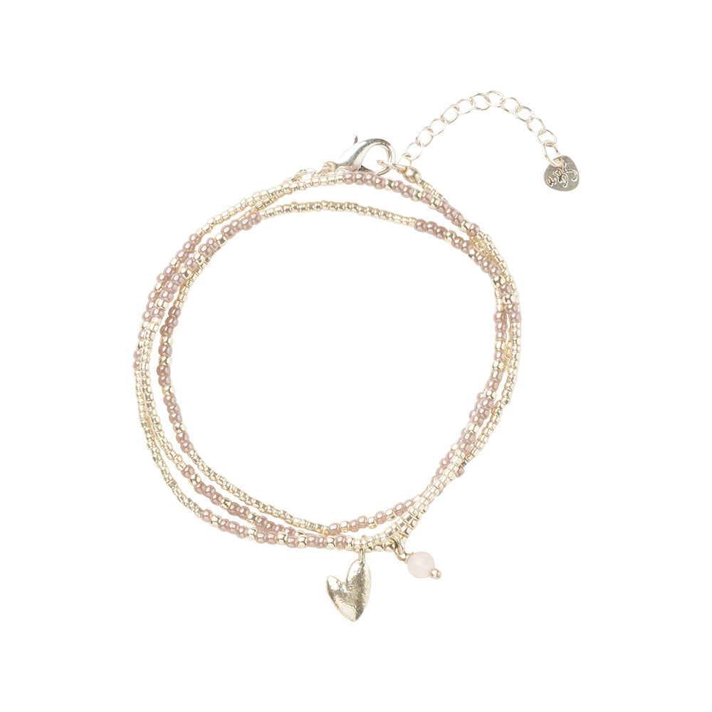 Unsere Honored Rose Quartz Halskette kann nicht nur um den Hals getragen werden, sondern auch als dreifach gewickeltes Armband. Zwei gute Gründe, warum dieses Schmuckstück zu einem absoluten Klassiker geworden ist! Mit Rosenquarz, der als „Stein der Liebe” gilt, und einem herzförmigen Anhänger: Ein liebevolles Geschenk für einen geliebten Menschen oder für sich selbst, als Zeichen der Selbstfürsorge.