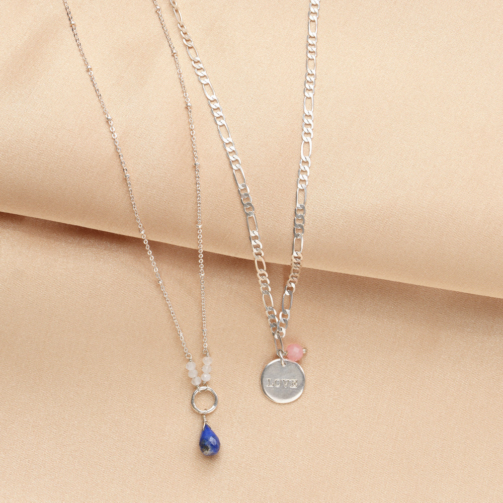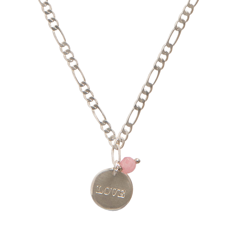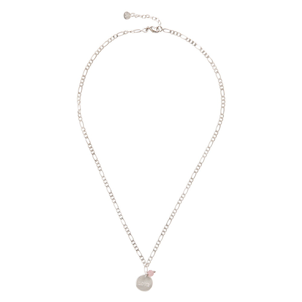 Darf ich vorstellen: die versilberte Idol Rosenquarz Halskette von A Beautiful Story. Diese flache Halskette ist aus versilbertem Messing handgefertigt. Sie besteht aus einem kleinen Rosenquarz-Anhänger und einem vergoldeten Münzanhänger, in den das Wort "love" eingraviert ist. Das Kettenmuster verleiht der Halskette einen gewagten Look. Die verstellbare Länge beträgt 45-48 cm.