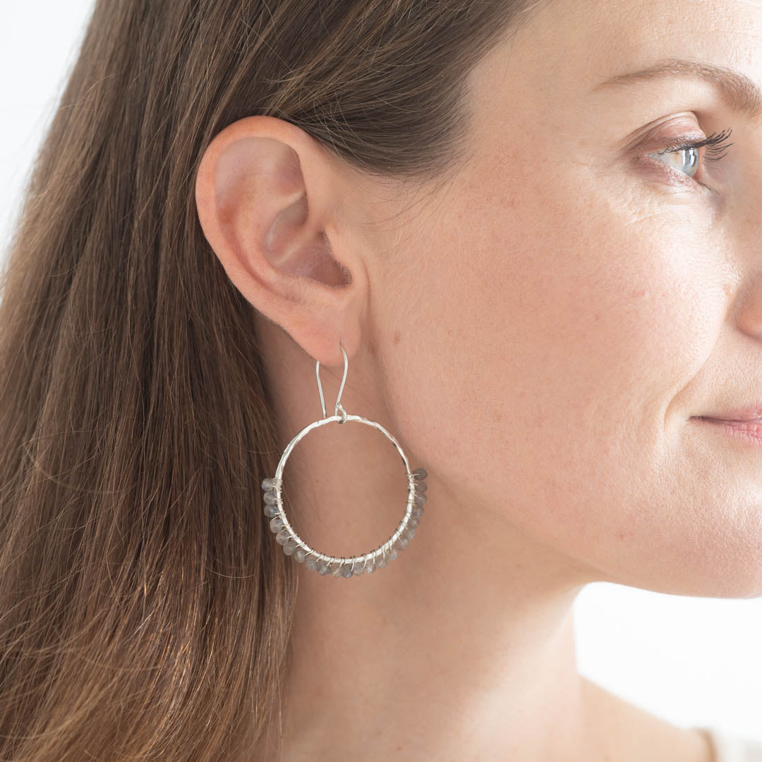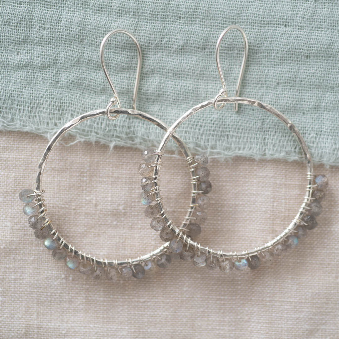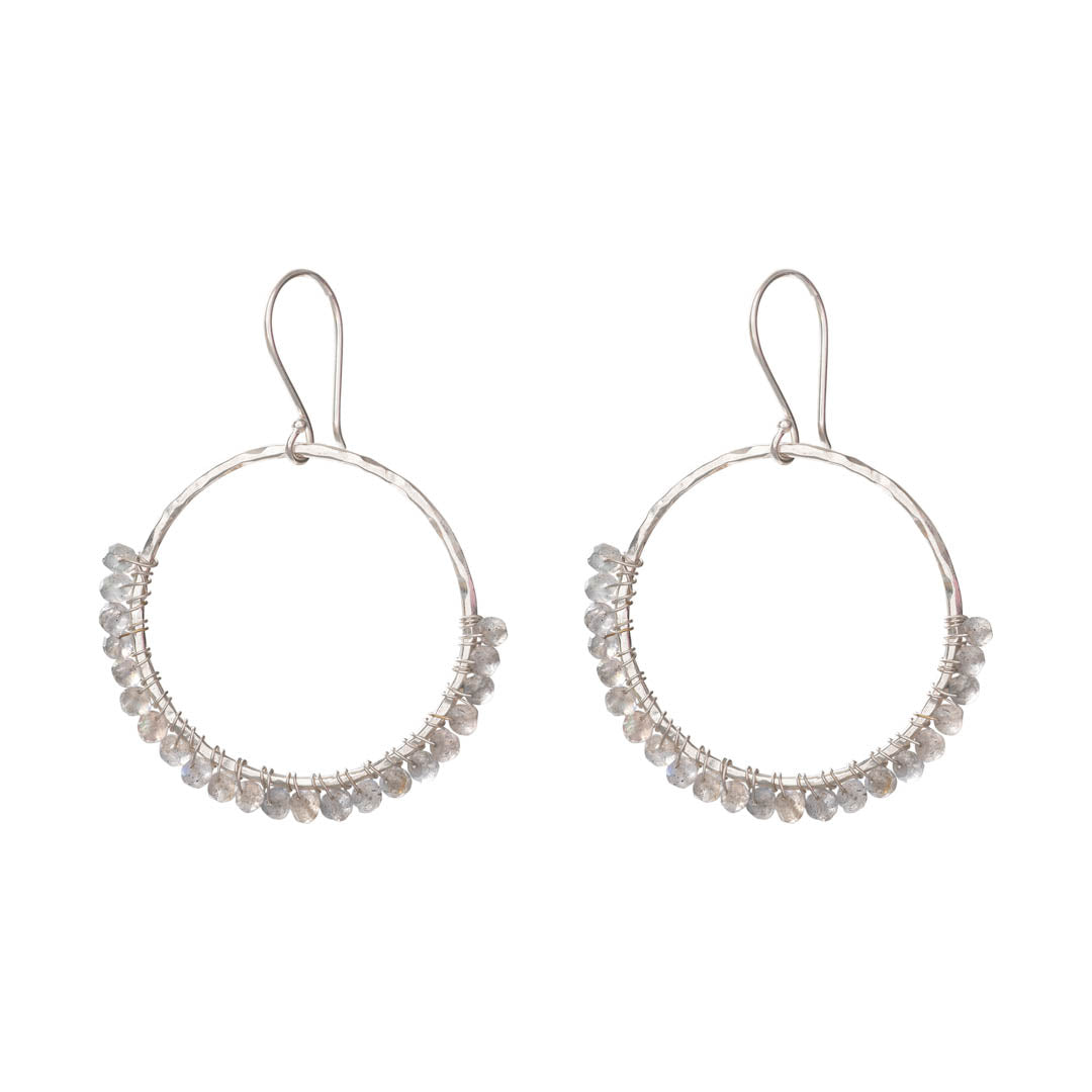Die versilberten Kindness Labradorit Ohrringe von A Beautiful Story besitzen einen versilberten ovalen Ring mit kleinen Labradorit-Edelsteinen. Diese Hakenohrringe haben eine Länge von 5,5 cm.