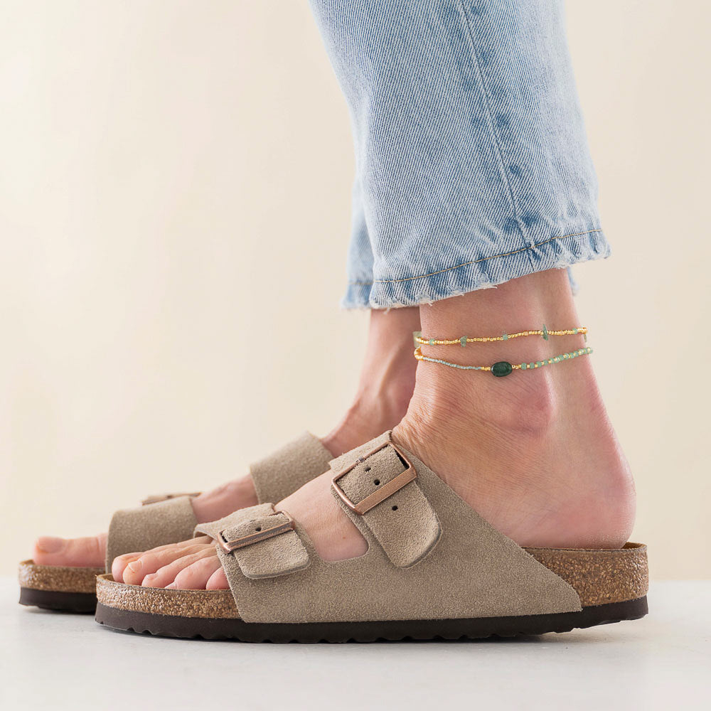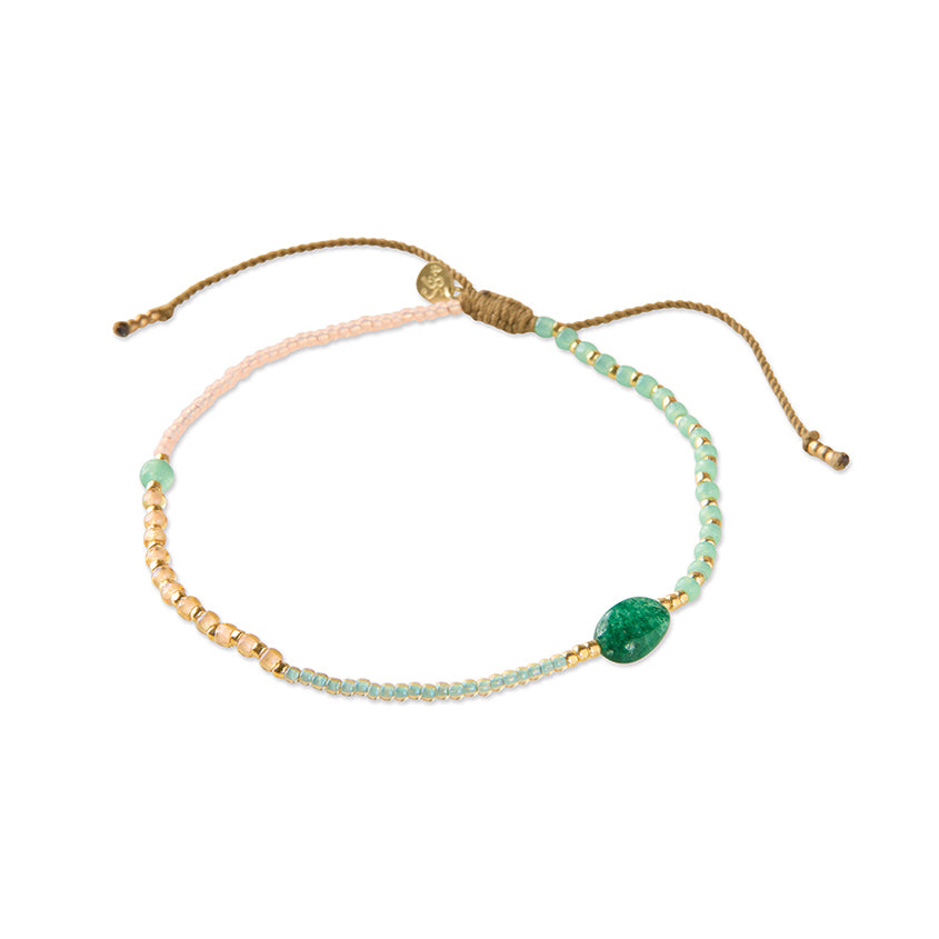 Das goldfarbige Liberation Aventurin Fußkettchen ist handgefertigt mit einem kleinen glatten Aventurin Edelstein. Die Glasperlen in Pfirsich-, Grün- und Goldtönen sind auf einem Baumwollfaden mit Schiebeknoten aufgereiht. Dadurch ist das Armband von 22 - 30 cm verstellbar. Der Aventurin motiviert und du machst jeden Schritt mit Freude.