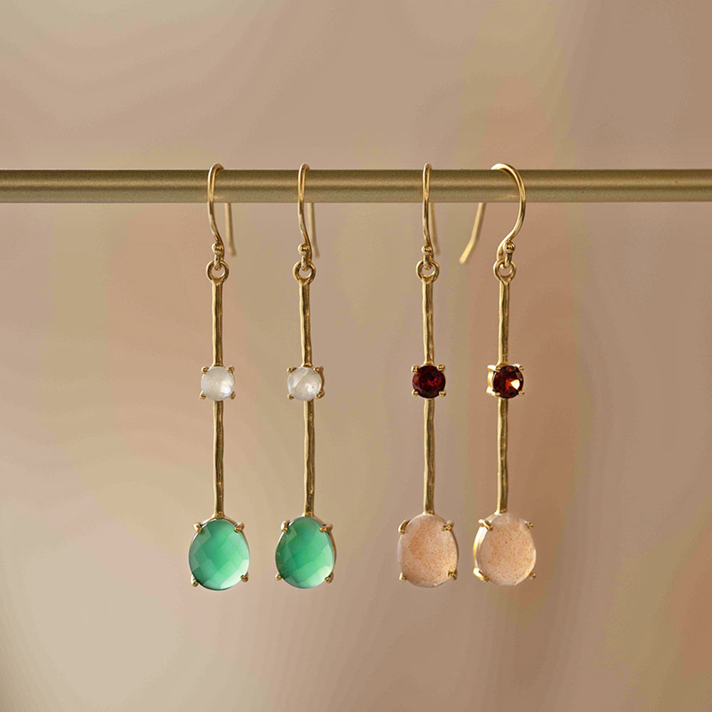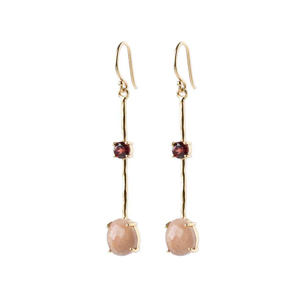 Beruhigende, liebevolle Energie und Kraft. Dies, zusammen mit einem stilvollen Aussehen, ist das Geschenk unserer Magnificent Pfirsich-Mondstein Ohrringe. Mit facettiertem Pfirsich-Mondstein und Granat, befestigt an einem eleganten vergoldeten Stabanhänger. Zeitlos, stilvoll und von höchster Qualität. Entworfen, um Freude zu bereiten, hergestellt, um lange zu halten. Sorgfältig handgefertigt in Jaipur, Indiens Hauptstadt der Edelsteine.