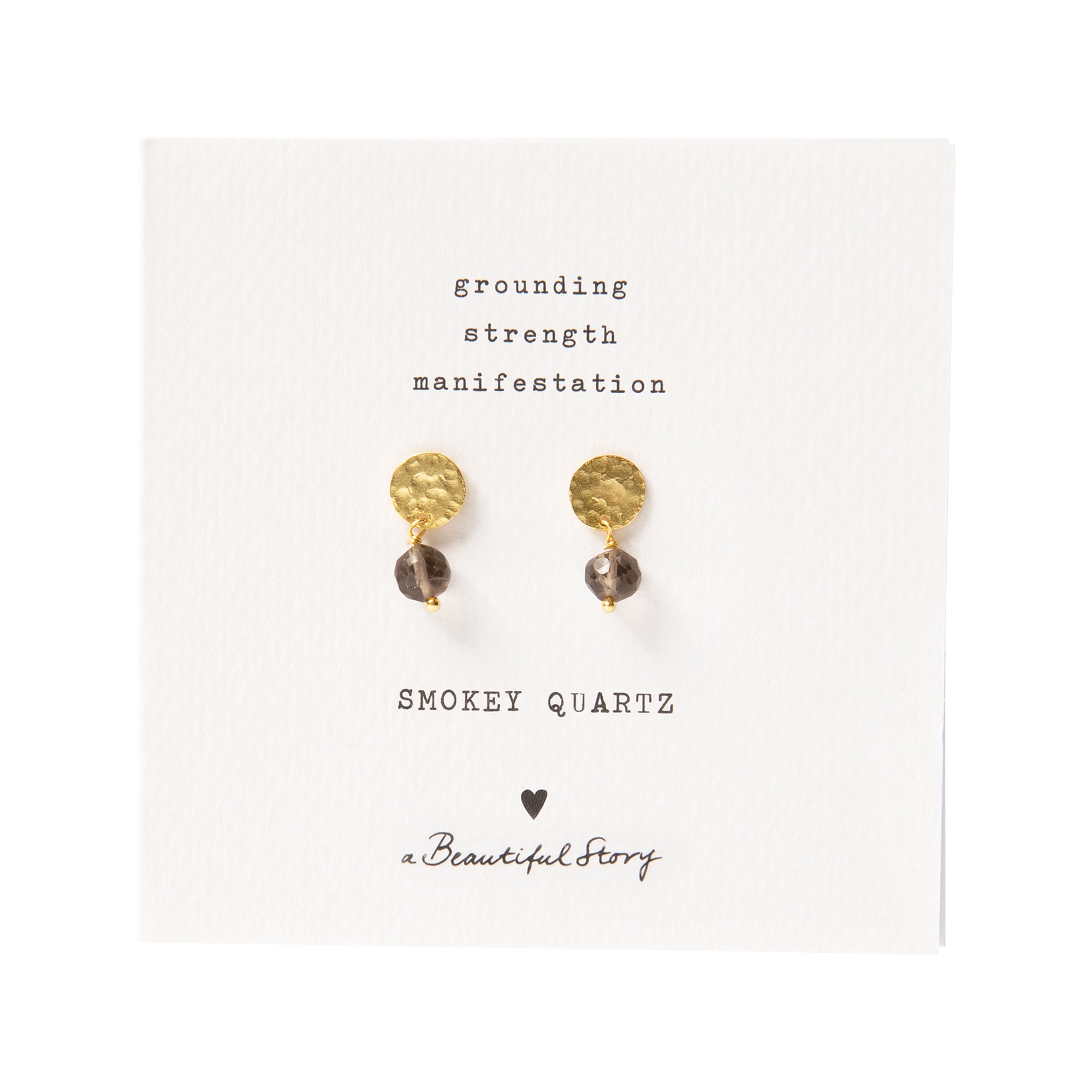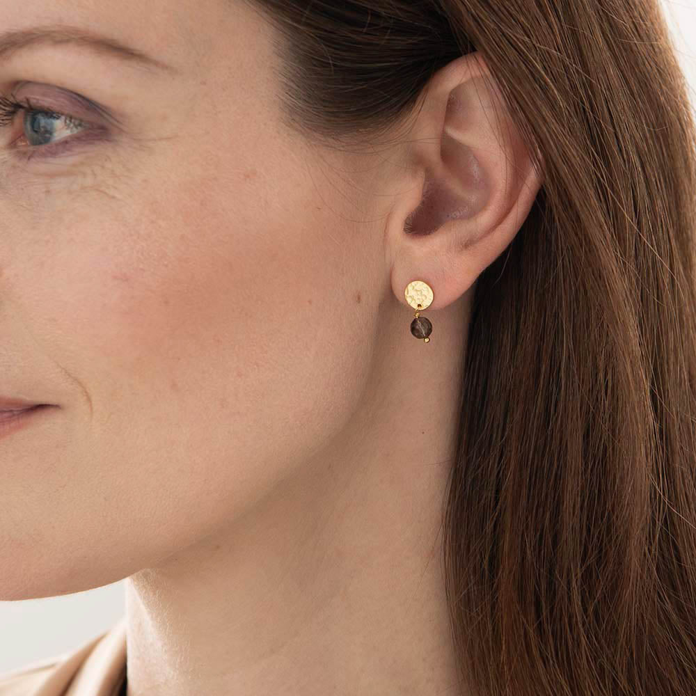 Die vergoldeten Mini Coin Rauchquarz Ohrringe von A Beautiful Story sind kleine Ohrstecker mit einer Länge von 1,5 cm. Die handgefertigten Ohrstecker bestehen aus einer goldfarbigen Münze und einem kleinen Rauchquarz-Edelstein.