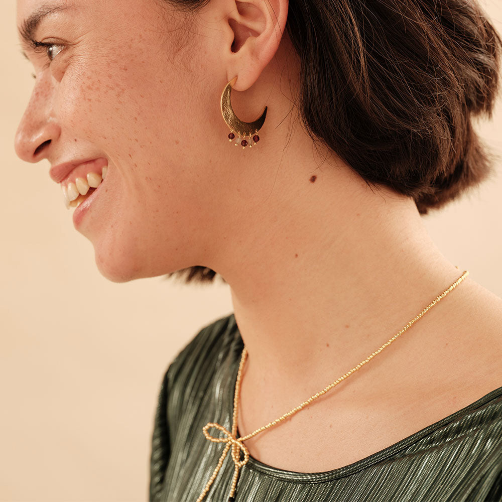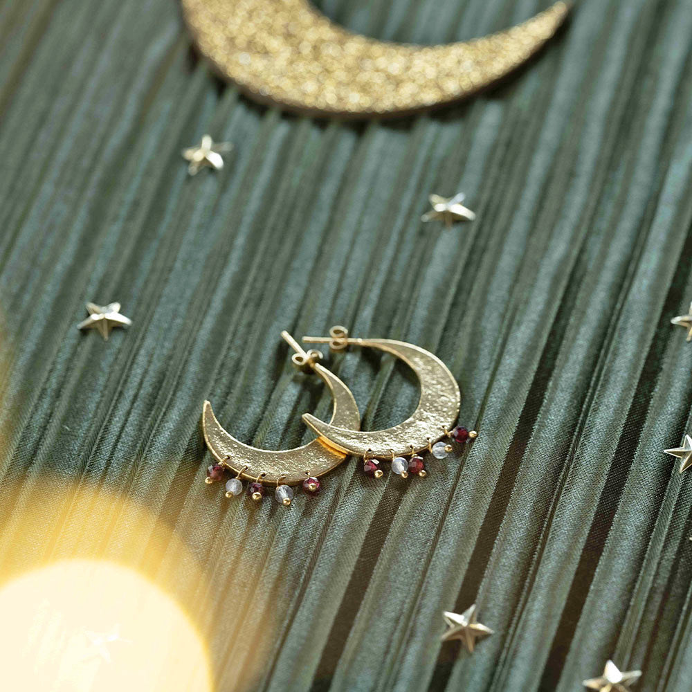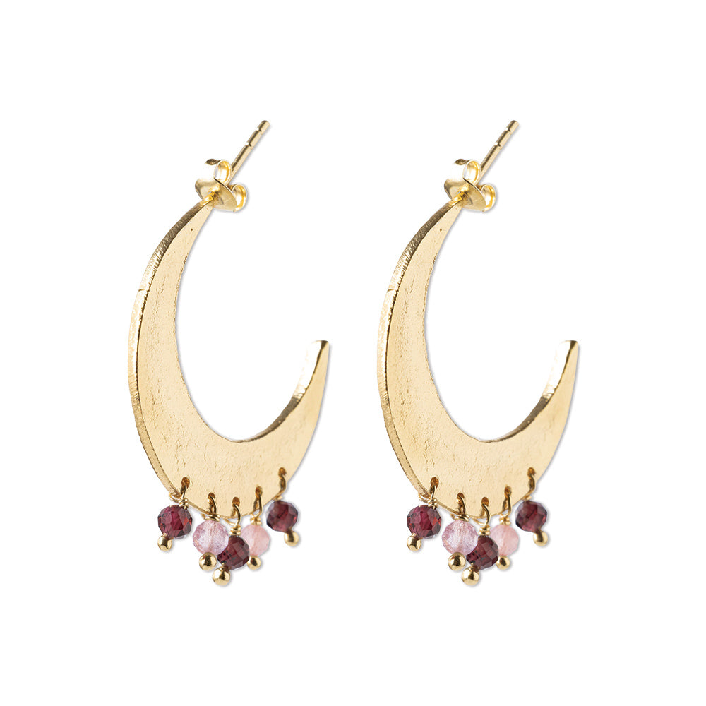Mystische Halbmond Schmuckstücke, vergoldet und mit facettiertem Rosenquarz und Granat-Edelsteinen versehen. Die Mystic Granat Rosenquarz Ohrringe sind gemacht für festliche Momente. Gekrönt von der Liebe des Rosenquarzes und der Energie des Granats, strahlst du im Augenblick voller Freude.