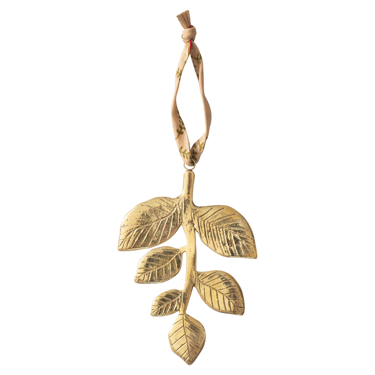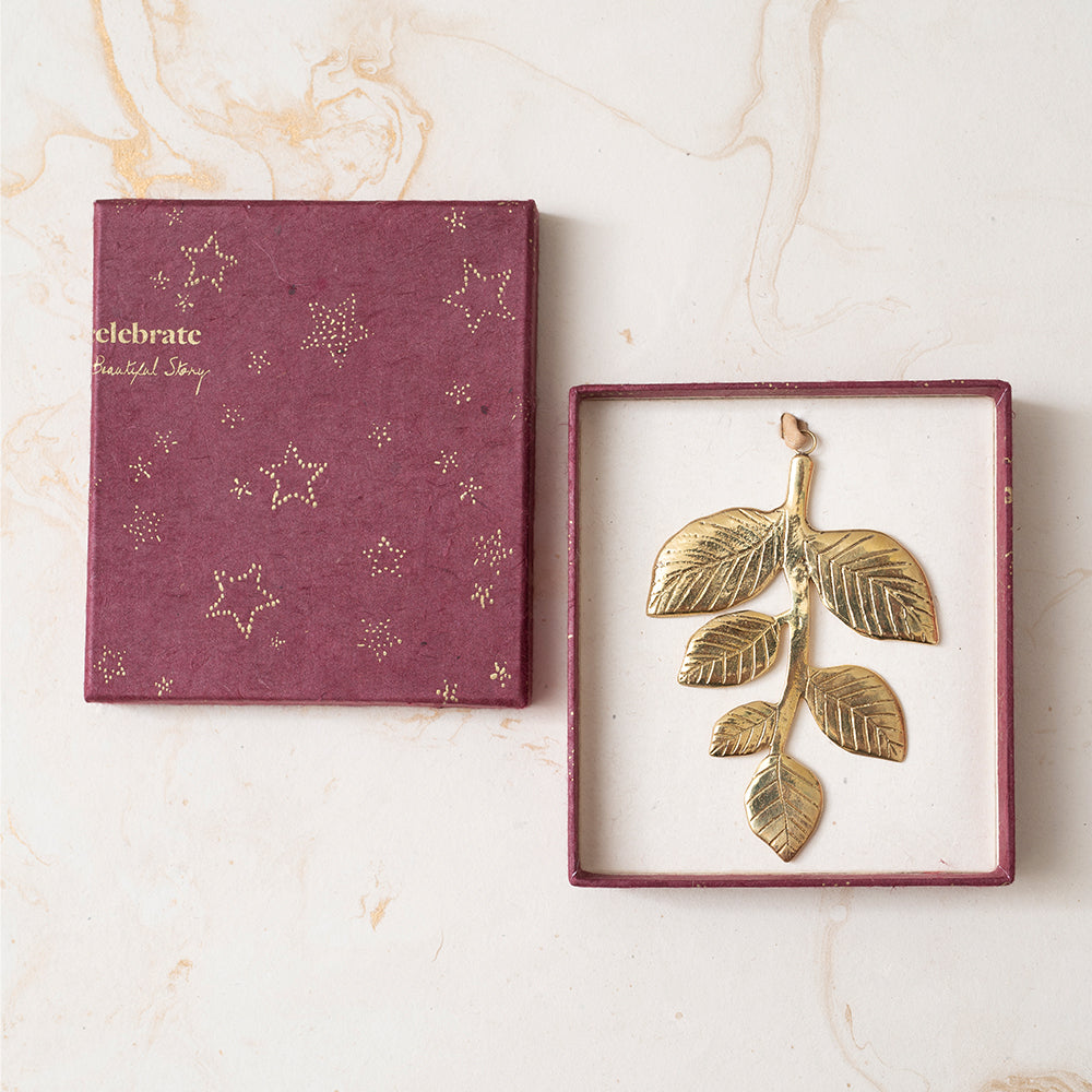 Diese Ornament in Form eines Olivenzweigs wird aus Messing in Nepal von Hand gefertigt. Die Kordel zum Aufhängen der Dekoration wird aus recycelten Saris hergestellt. Das Ornament ist ca. 75 x 110 mm groß und wird in einer Papier-Geschenkbox mit den Maßen 120 mm x 120 mm x 25 mm geliefert.