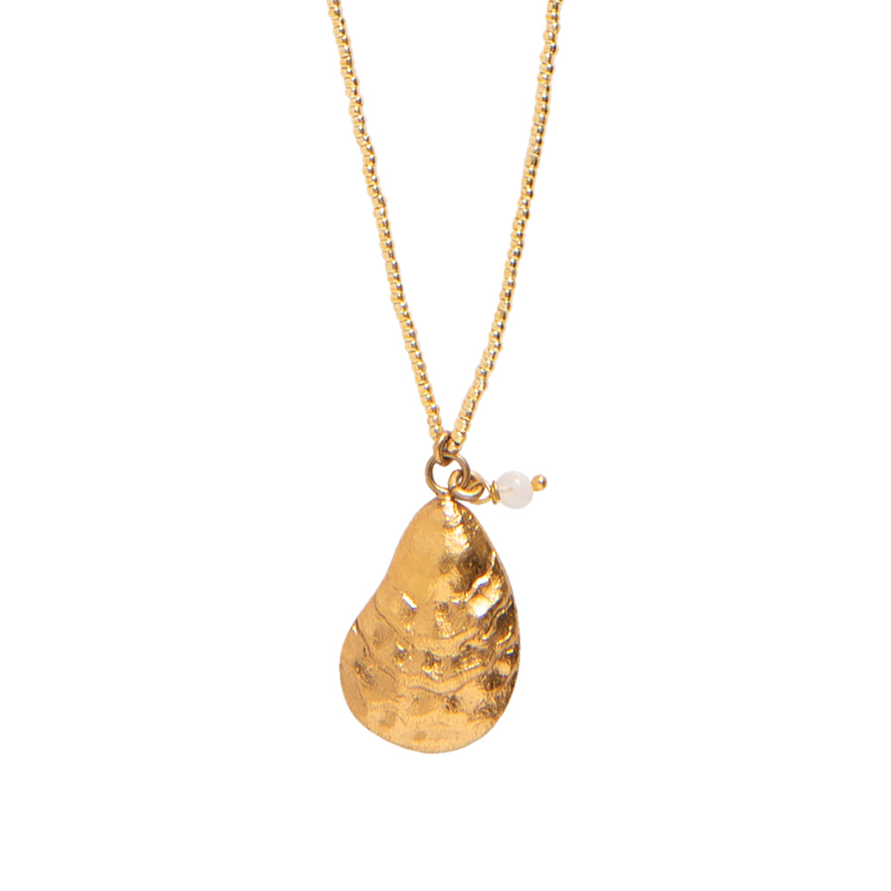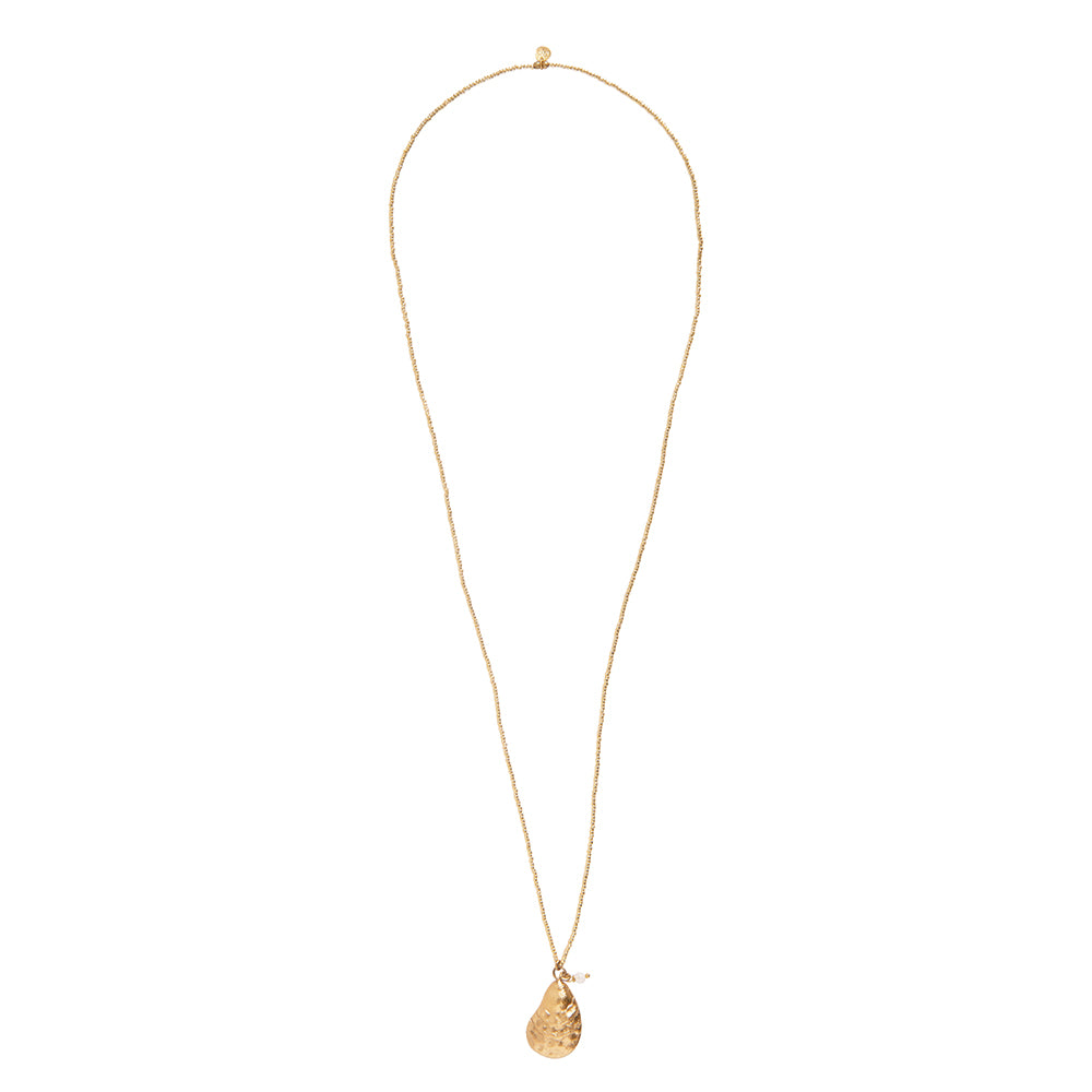 Entdecke die vergoldete Paradise Mondstein Halskette von A Beautiful Story. Dieser Klassiker vereint Glasperlen, einen kleinen Mondstein-Anhänger und einen vergoldeten Austern-Anhänger. Die Länge beträgt 70 cm.