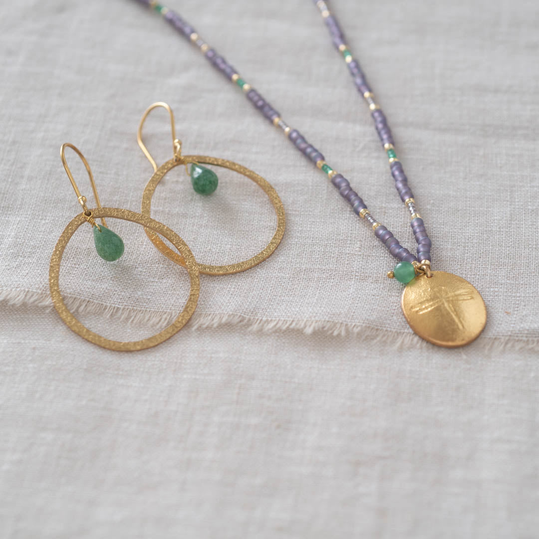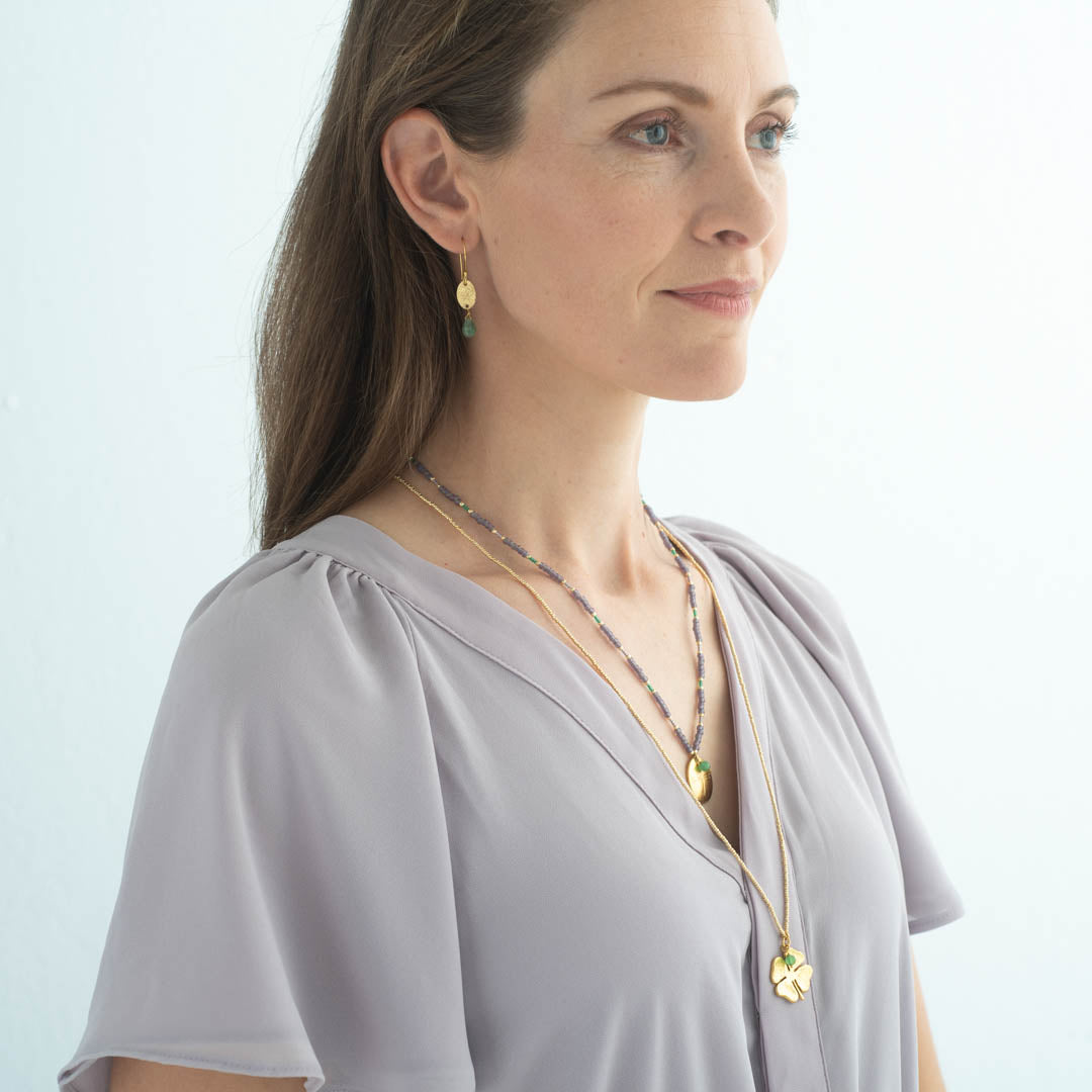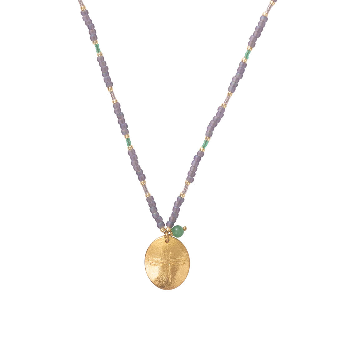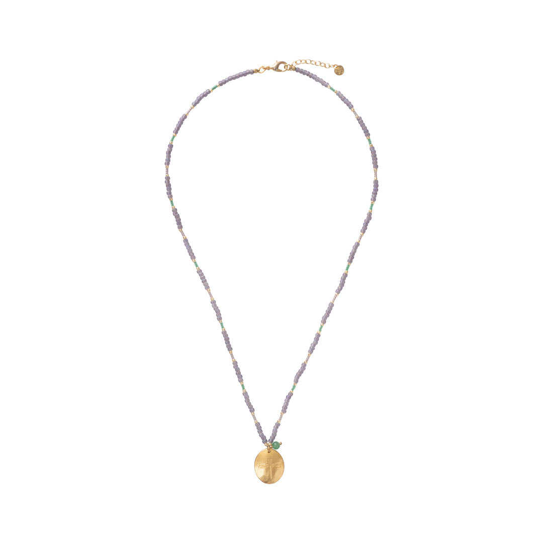Die goldfarbige Prayer Aventurin Halskette von A Beautiful Story ist aus Glasperlen gefertigt. Sie ist mit einem kleinen Aventurin-Edelstein und einem Libellen-Anhänger aus vergoldetem Messing versehen. Die Halskette hat eine Länge von 52 - 55 cm.