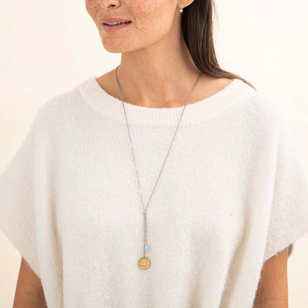 Die goldfarbige Purpose blauer Spitzenachat Halskette von A Beautiful Story ist eine wunderschöne, handgefertigte Halskette, die aus Glasperlen und vergoldetem Messing gefertigt ist. Sie ist mit drei kleinen blauen Spitzenachat-Edelsteinen versehen. Die Kette teilt sich in zwei Enden, was der Kette einen einzigartigen Look verleiht. An einem Ende hängt ein großer blauer Spitzenachat-Edelsteinanhänger und am anderen Ende eine vergoldete Münze mit einem Kleeblatt-Symbol. Mit einer Länge von 80 cm passt die Halskette einfach jedem.