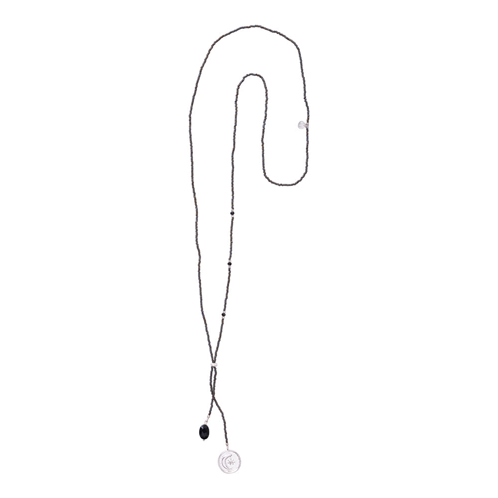 Die silberfarbige Purpose schwarzer Onyx Halskette von A Beautiful Story ist eine wunderschöne, handgefertigte Halskette, die aus Glasperlen und versilbertem Messing gefertigt ist. Sie ist mit drei kleinen schwarzer Onyx-Edelsteinen versehen. Die Kette teilt sich in zwei Enden, was der Kette einen einzigartigen Look verleiht. An einem Ende hängt ein großer schwarzer Onyx-Edelsteinanhänger und am anderen Ende eine versilberte Münze mit einem Mond- und Sternsymbol.