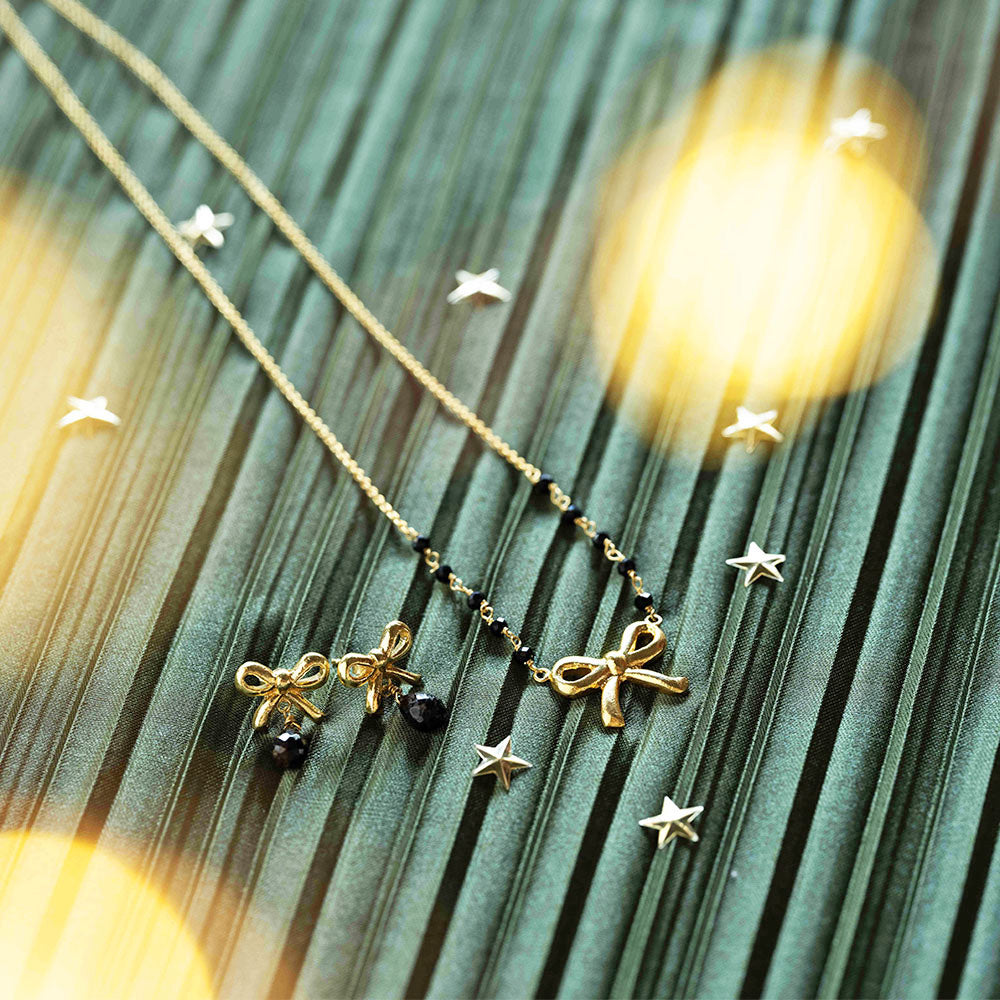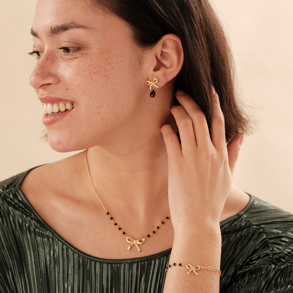 Jeder, der Liebe und Freundschaft entfacht, verdient ein Schleifchen - auch du selbst. Das macht unsere Schleifen Black Onyx Ohrringe zu einem liebevollen Geschenk, zum Geben und Empfangen. An einer vergoldeten Schleife elegant hängend, reflektieren die facettierten schwarzen Onyx-Edelsteine das Licht - kein Kerzenschein kommt da mit!