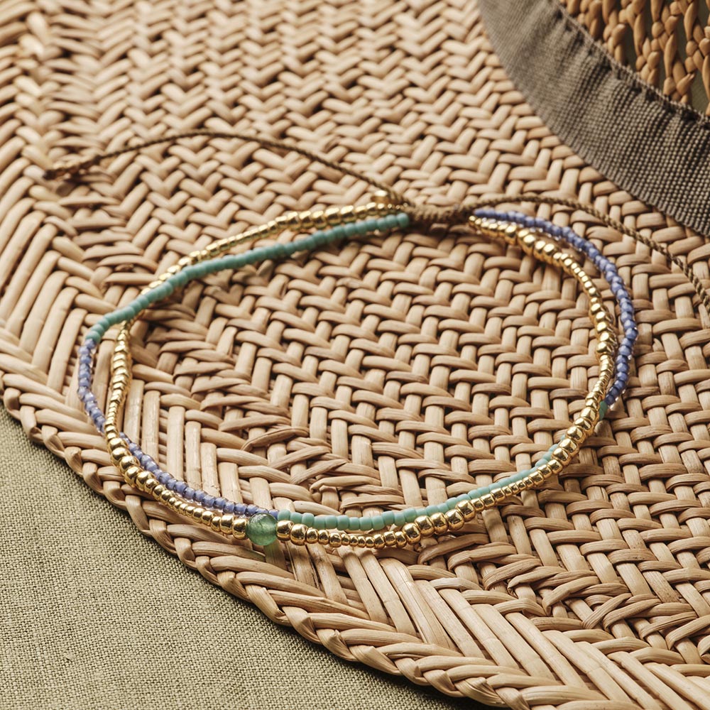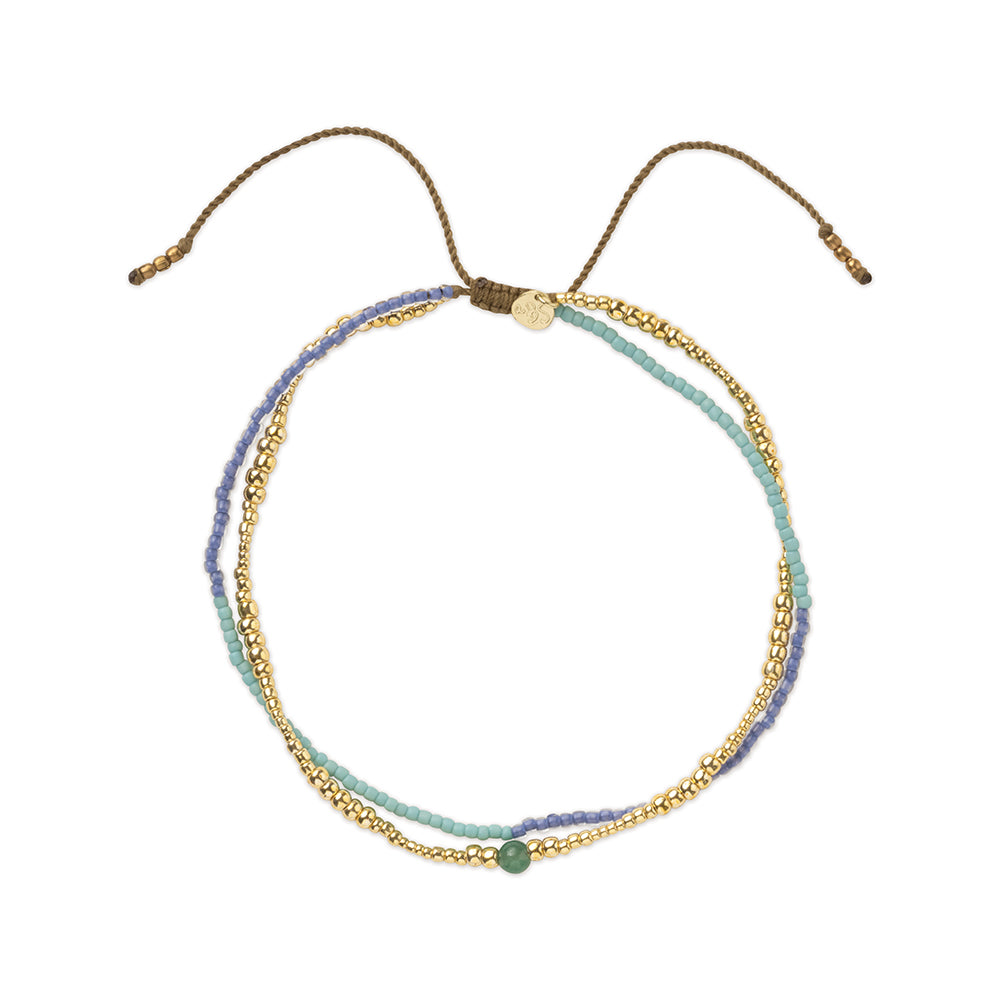 Ein handgefertigtes Fußkettchen, dass dich barfuß durch den Sand oder in deinen Lieblingssandalen begleitet. Das Sail Aventurin Fußkettchen ruft das ultimative Sommergefühl hervor. Zwei Stränge aus zierlichen Glasperlen in sanften Sommerfarben und ein kleines poliertes Tigerauge, mit dem du dich traust, Schritte zu machen. Wohin führt dich dieses fair gefertigte Schmuckstück?