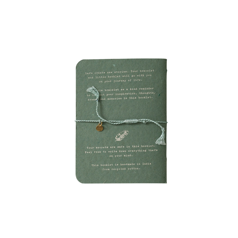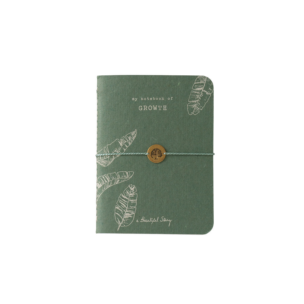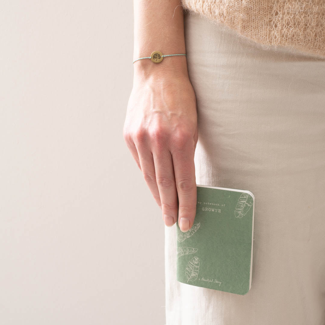 Lerne unser Storybook Growth kennen, ein 72-seitiges Mini-Notizbuch mit einem Armband, das eine Messingmünze mit Lebensbaum-Symbol trägt. Das Armband hat einen verschiebbaren Knoten aus Baumwollgarn. Das Storybook ist 8 cm x 11 cm groß (A7-Format).