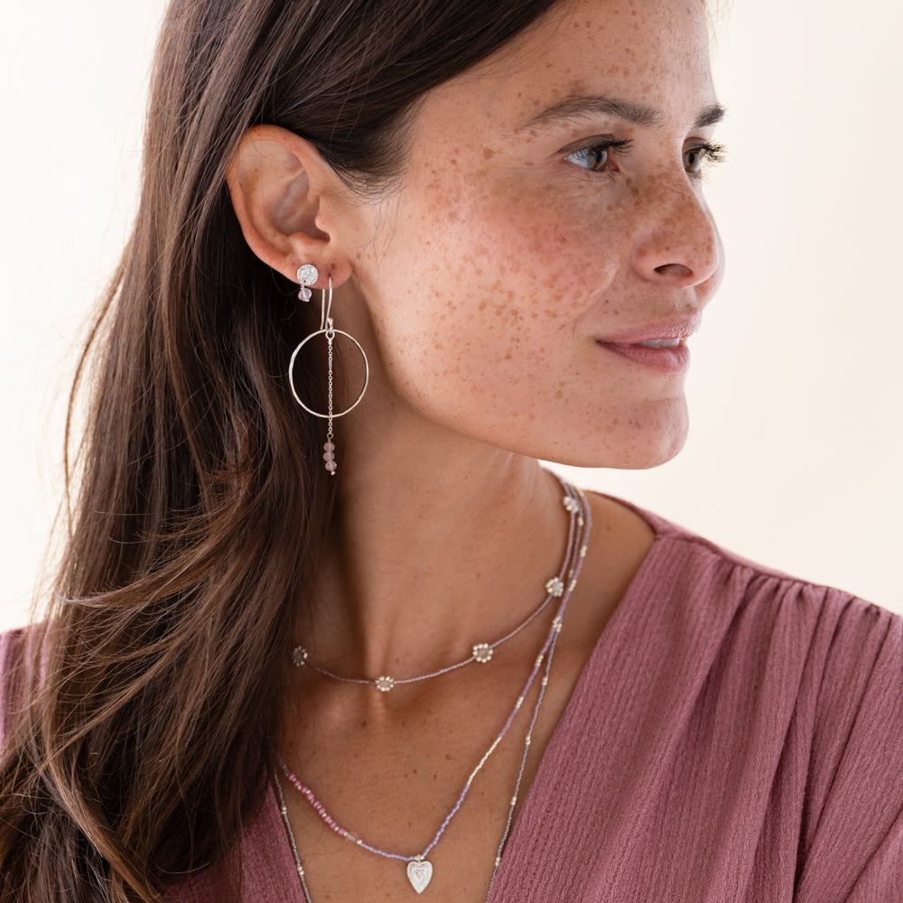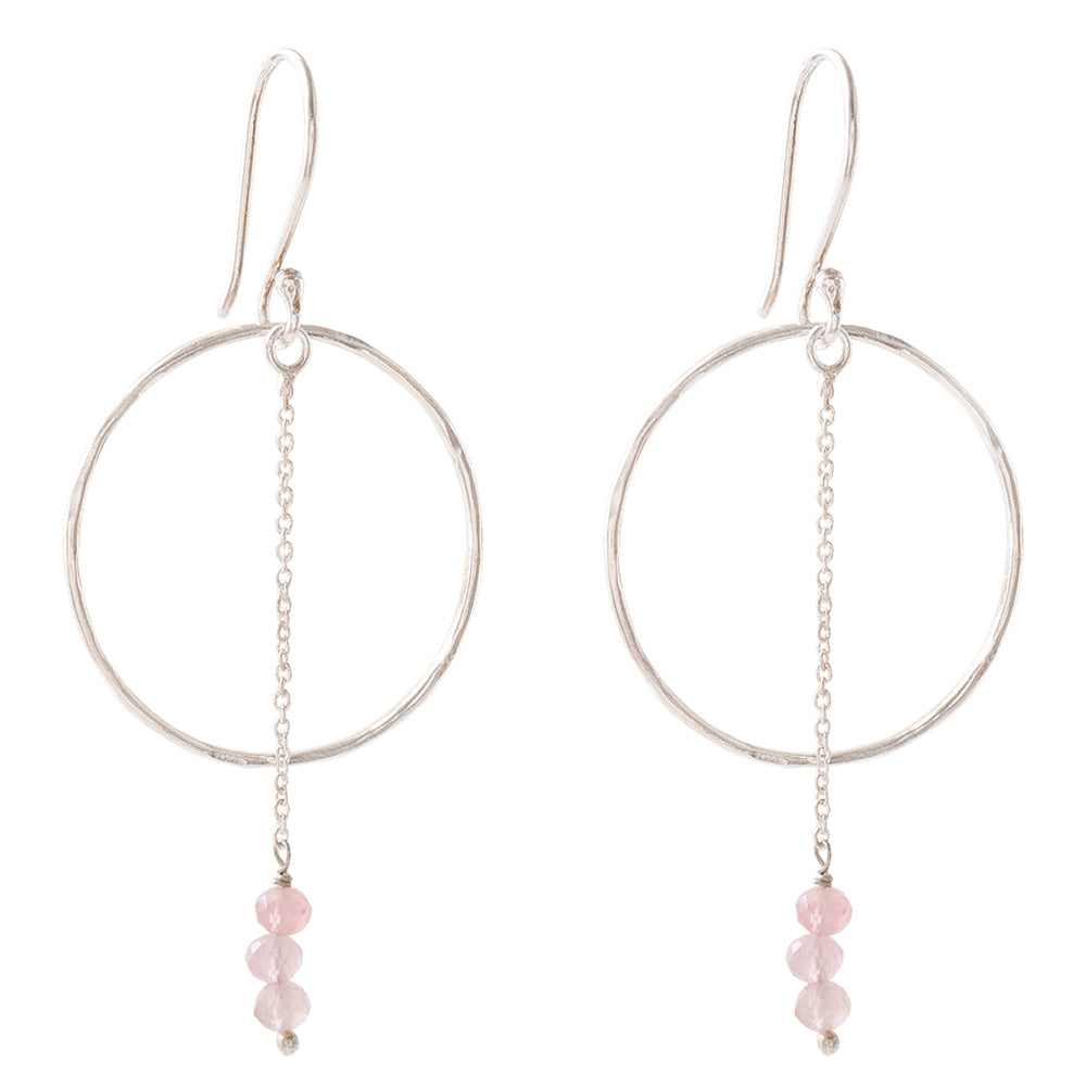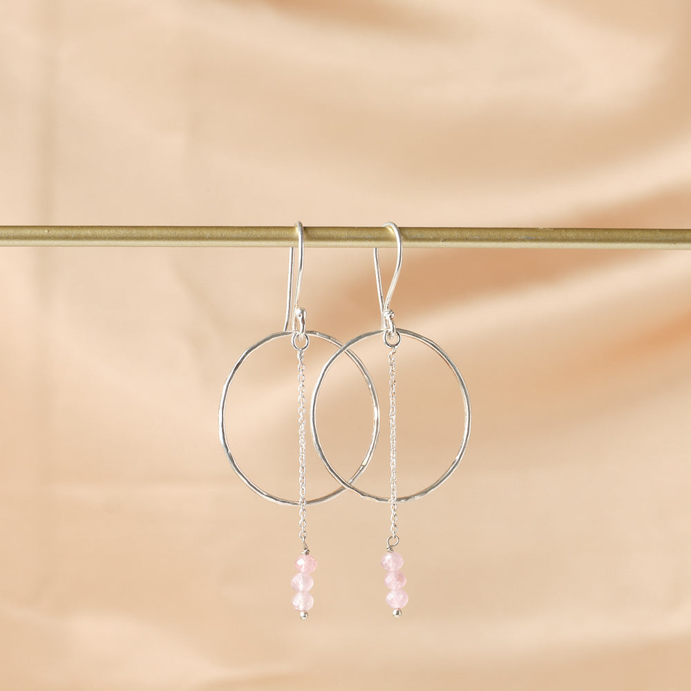 Erlebe zeitlose Eleganz mit den versilberten Talent Rosenquarz Ohrringen von A Beautiful Story. Diese Ohrringe sind aus versilbertem Messing handgefertigt und mit drei kleinen Rosenquarz-Edelsteinen versehen. Die Ohrringe sind 6 cm lang.