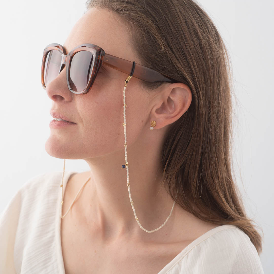 Die goldfarbige Trust Lapislazuli Brillenkette von A Beautiful Story ist aus Glasperlen und Gummi gefertigt und mit kleinen Lapislazuli-Edelsteinen versehen. Die Länge der Brillenkette beträgt 74 cm.