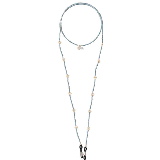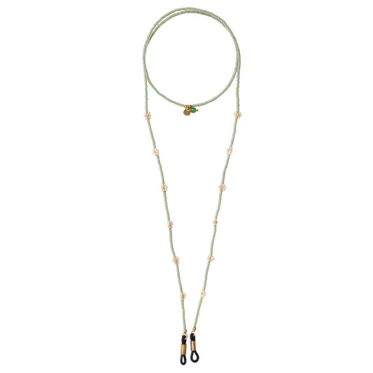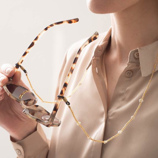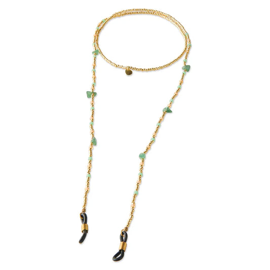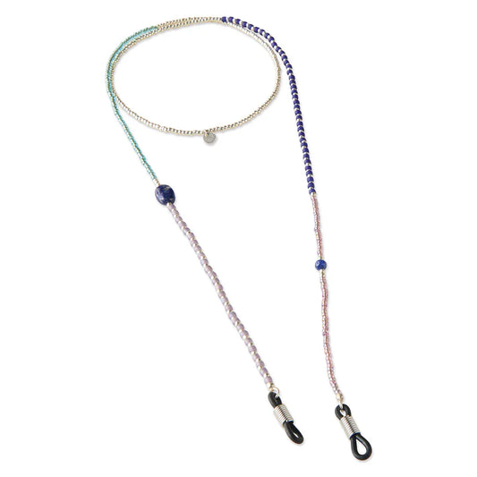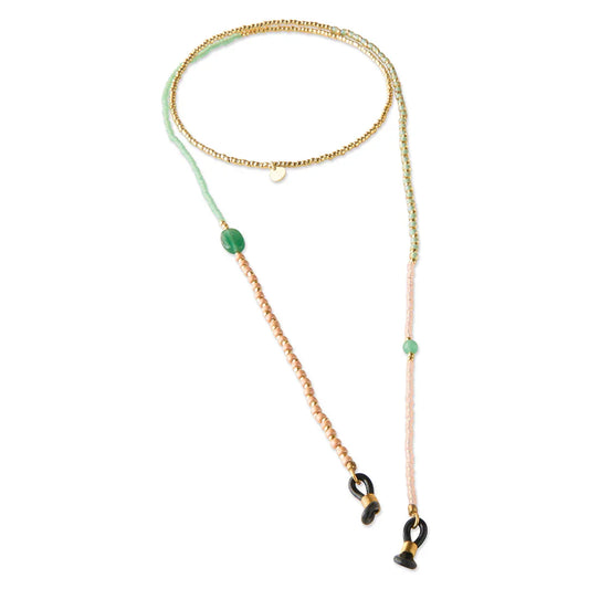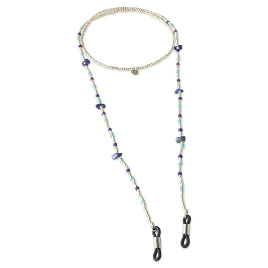 Onze brillenkoorden bestaan uit een combinatie van glaskralen, messing kralen en edelstenen, geregen op draad. De rubberen uiteindes bevestig je aan je bril, zonnebril of leesbril. De brillenkoorden zijn er in goud en in zilver en hebben kleurrijke edelstenen.