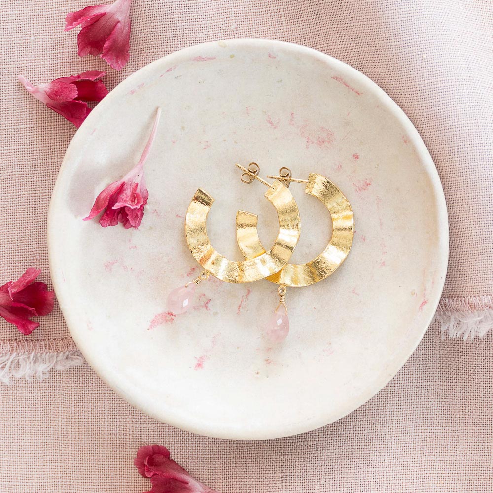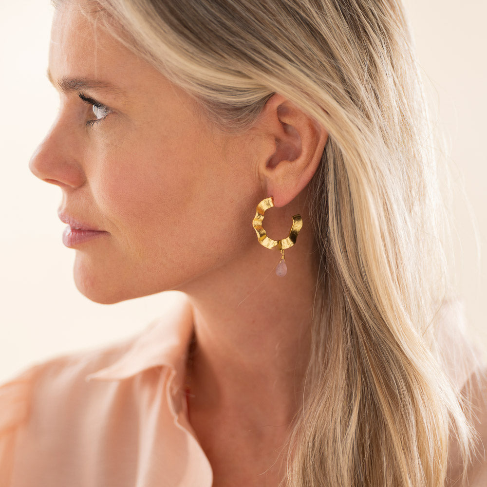 Ontdek de Ambitious Rozenkwarts Vergulde Oorbellen. Deze handgemaakte vergulde messing oorbellen vallen op door hun organische vorm en druppelvormige, gefacetteerde rozenkwarts edelsteen. Met een lengte van 4 centimeter zijn ze een mooie blikvanger. Rozenkwarts staat voor liefde, harmonie en behulpzaamheid.