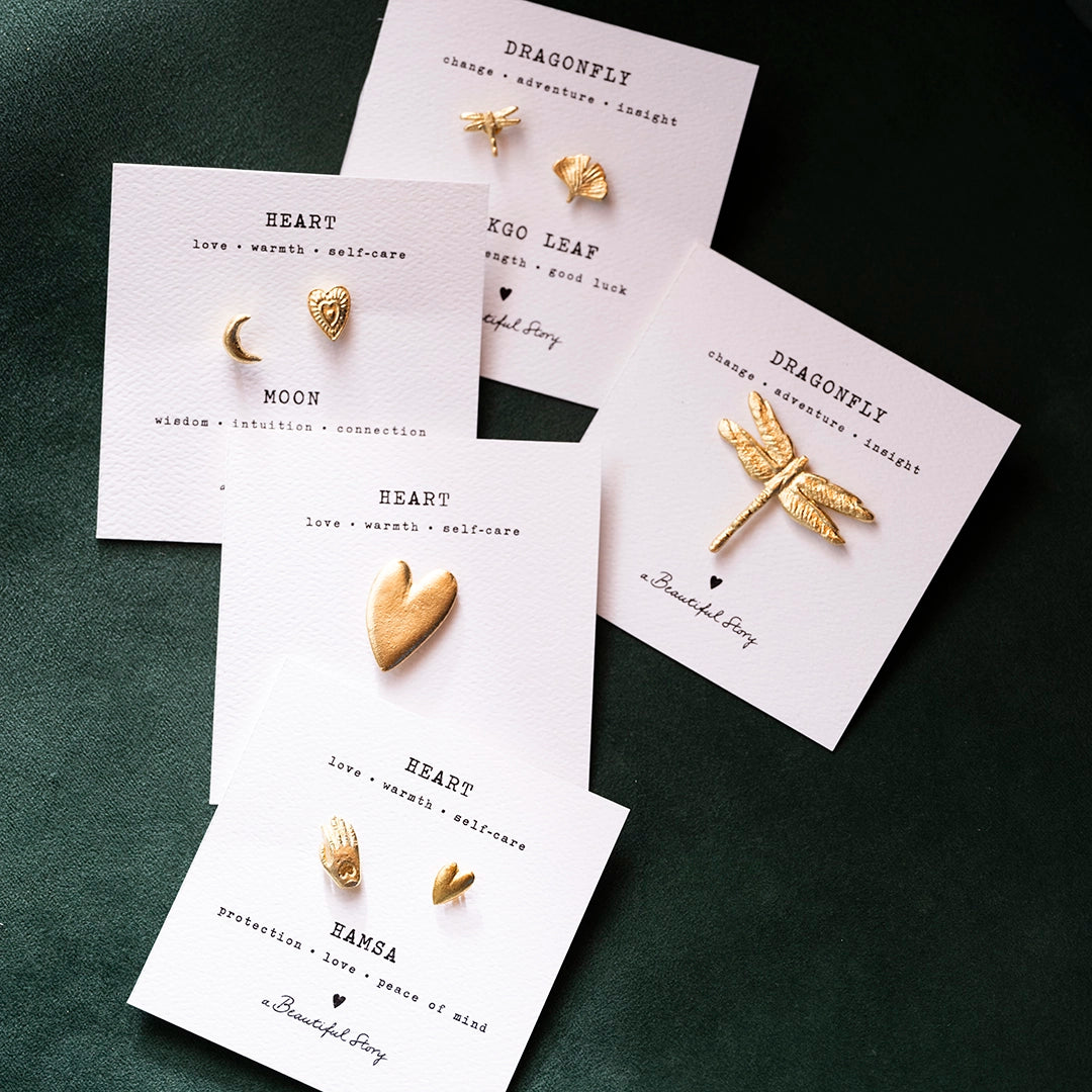Ontdek onze Broche Set Hamsa - Hart Verguld. Twee handgemaakte broches van verguld messing in de vorm van een hart en hand symbool. De broches zijn tussen de 1 - 1,5 centimeter lang. En het kaartje is 74 x 74 millimeter.