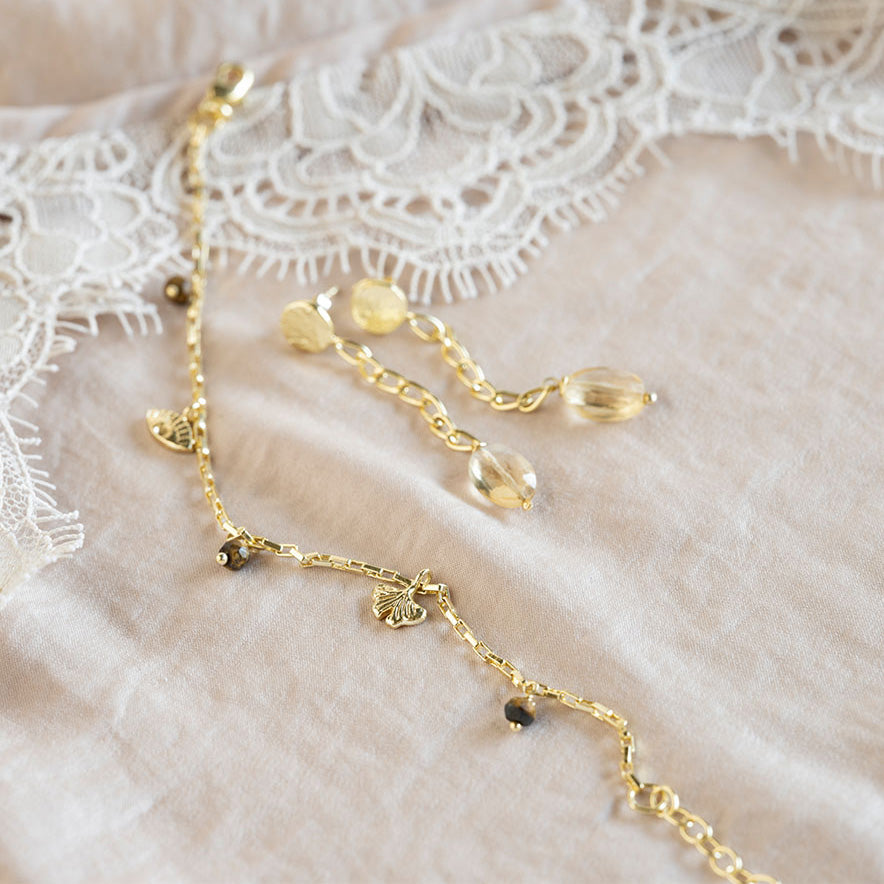 Een charmer is het zeker, de Charmed Tijgeroog Armband. Slanke vergulde schakels gegarneerd met kleine facetgeslepen tijgeroog-edelstenen, een verguld ginkgo-blad en een alziend oog-symbool. Perfect voor wie lef, een heldere blik en geluk nastreeft. En haar bling-bling liefst fairmade ziet.