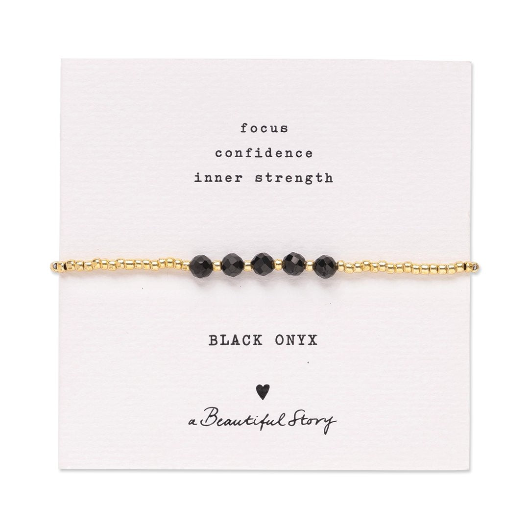 Ontdek de magie van de Essential Zwarte Onyx Goudkleurige Armband uit onze Classics collectie. De armband is verstelbaar dankzij een handige schuifknoop, waardoor hij perfect om elke pols past. Met glinsterende glazen goudkleurige kralen en 5 geslepen zwarte onyx edelstenen is deze a Beautiful Story armband ideaal voor elke gelegenheid.