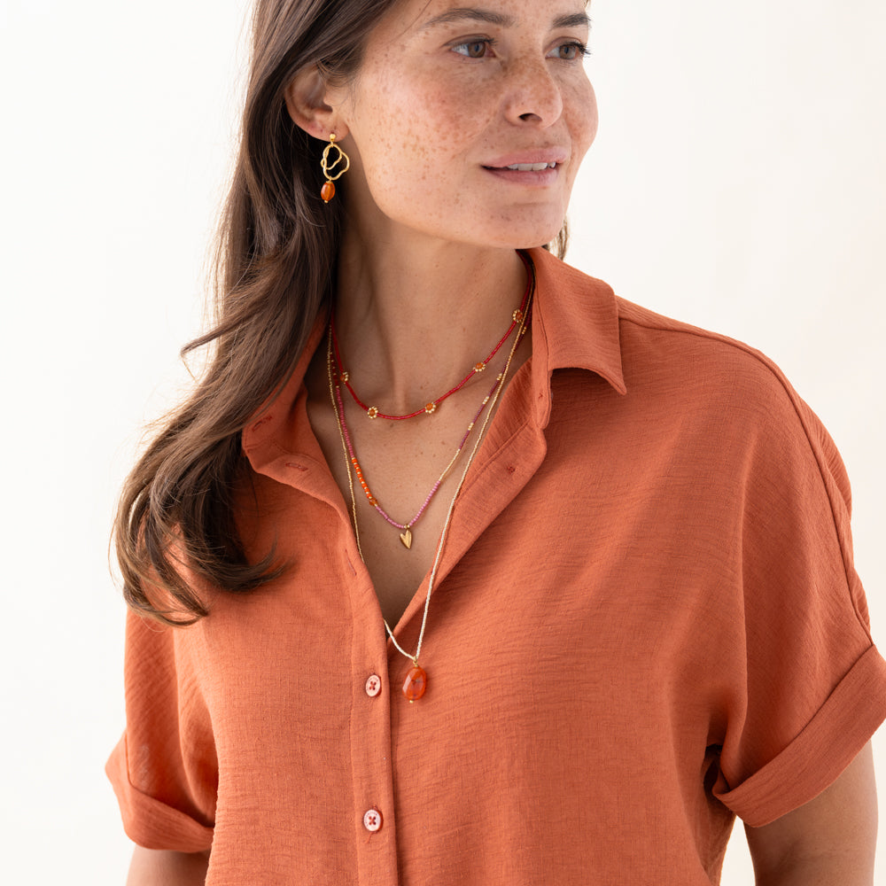 Ontdek onze Flourish Carneool Goudkleurige Ketting. De glaskralen en kleine carneool edelstenen vormen samen vijf kleine bloemen. De vergulde sluiting geeft de ketting een verstelbare lengte van 40 tot 43 centimeter.