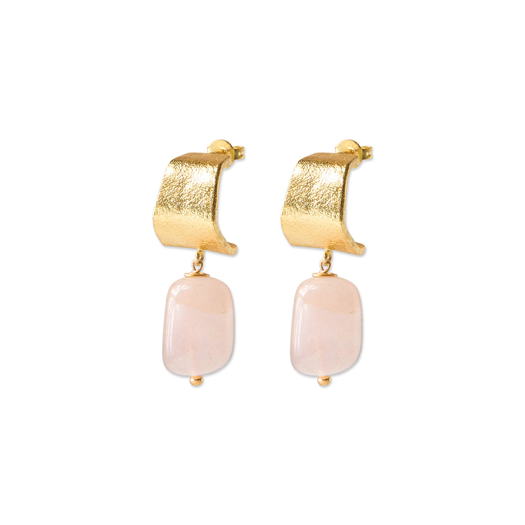 De Honest Rozenkwarts Vergulde Oorbellen zijn een echte statement. Ze zijn handgemaakt van verguld messing en hebben een organisch gevormde bovenkant met een matte textuur. De oorbellen zijn 3,5 centimeter lang. De grote rozenkwarts edelsteen geeft de oorbellen extra betekenis. Rozenkwarts brengt liefde en harmonie in je leven en nodigt je uit om met zachtheid naar jezelf en anderen te kijken.