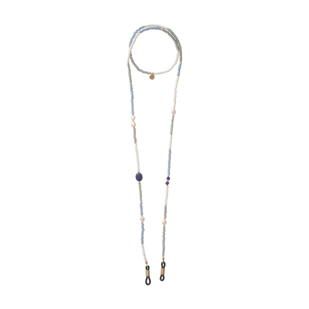 Dit Midsummer Lapis Lazuli Goudkleurige Brillenkoord van A Beautiful Story is gemaakt van glaskralen, parelmoerkralen, kleine lapis lazuli edelstenen en rubber. Het brillenkoord heeft een lengte van 74 centimeter.