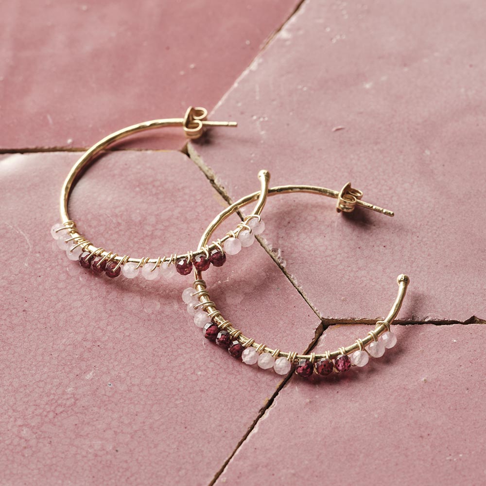 Om door een ringetje te halen, zo mooi. De Muse Rozenkwarts Granaat Oorbellen stelen de show met verfijnde rozenkwarts en granaat, symbolen van liefde en passie. De facetgeslepen edelstenen zijn geregen aan sierlijke ‘creolen’ van gehamerd en verguld messing. Summer-chicness op zijn best!