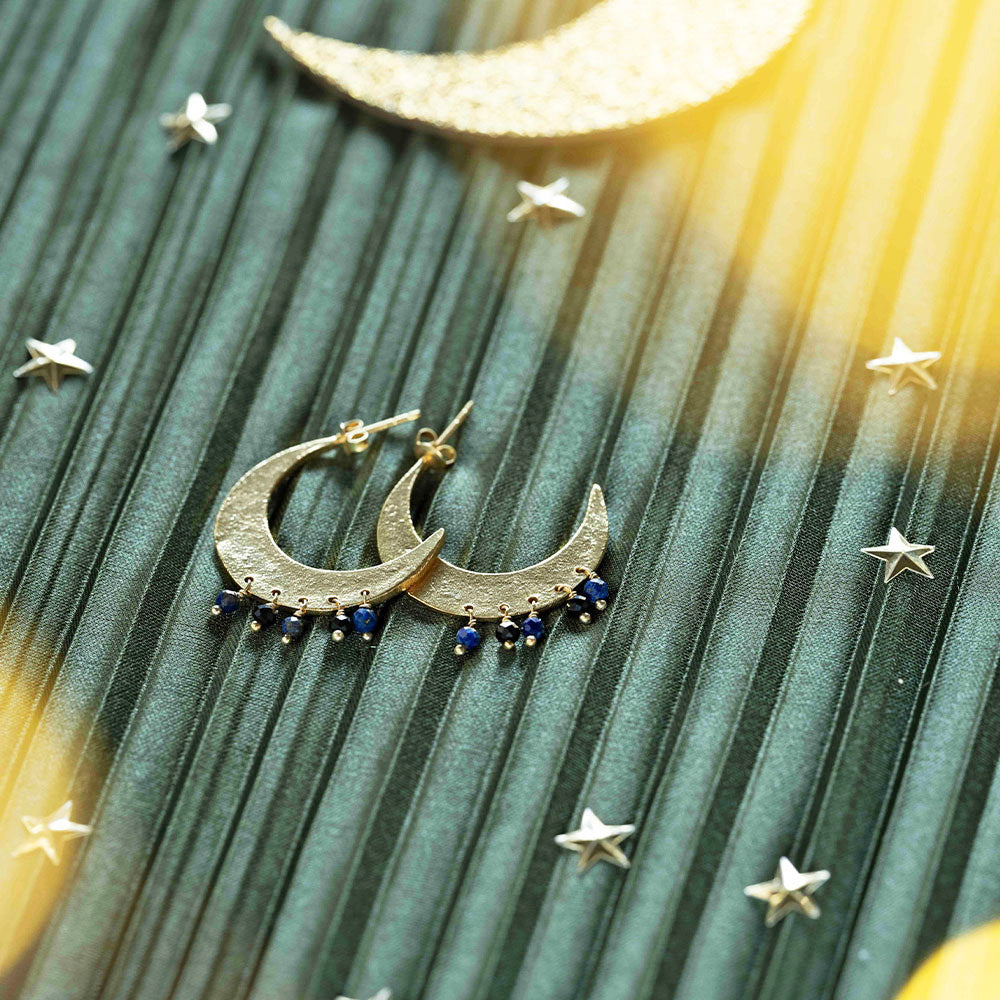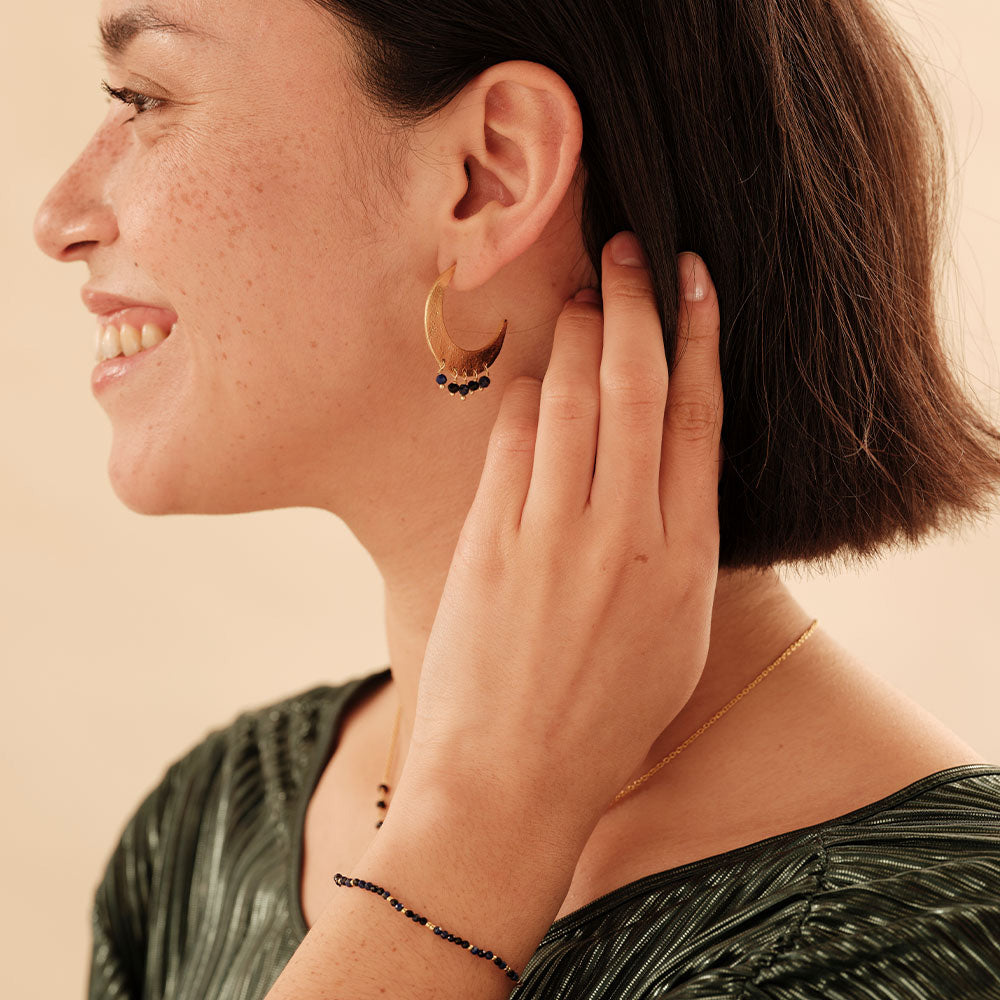 Mystieke halve manen, rijk verguld en voorzien van facetgeslepen zwarte onyx. De Mystic Zwarte Onyx Lapis Lazuli Oorbellen zijn gemaakt voor feestelijke vieringen. Met zwarte onyx als reminder van innerlijke kracht en lapis lazuli als symbool van vriendschap en verbinding voel je je gekoesterd in het moment.