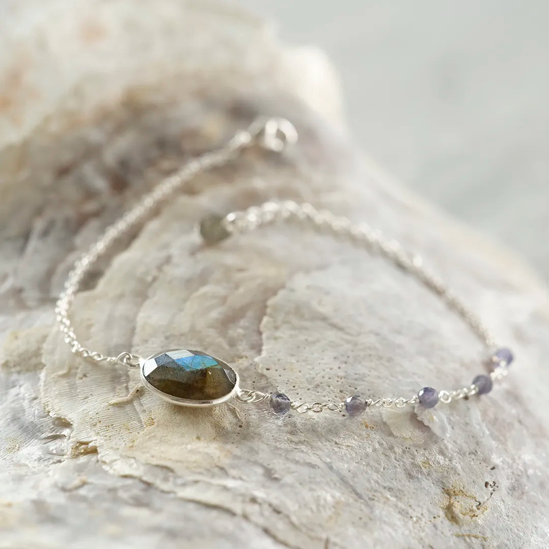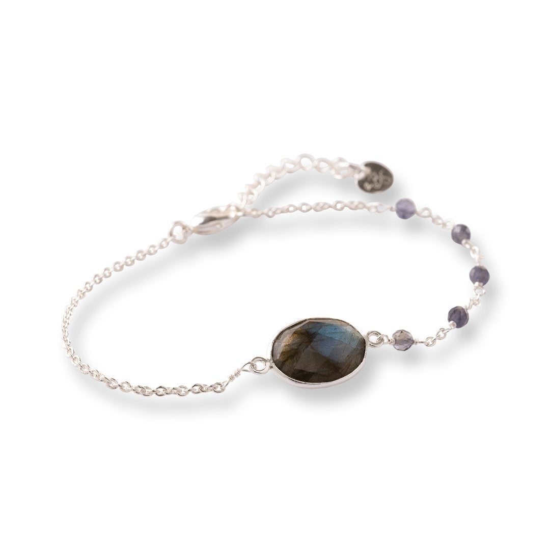 Op zoek naar een bijzondere armband? De Promising Labradoriet Ioliet Armband uit onze Timeless Treasures collectie is er voor je. Deze verzilverde armband heeft 5 kleine gefacetteerde ioliet edelstenen en een ovale gefacetteerde labradoriet edelsteen. Handgemaakt in Jaipur, India, is deze armband meer dan alleen een accessoire: het is een lucky tool dat je begeleidt op je pad.