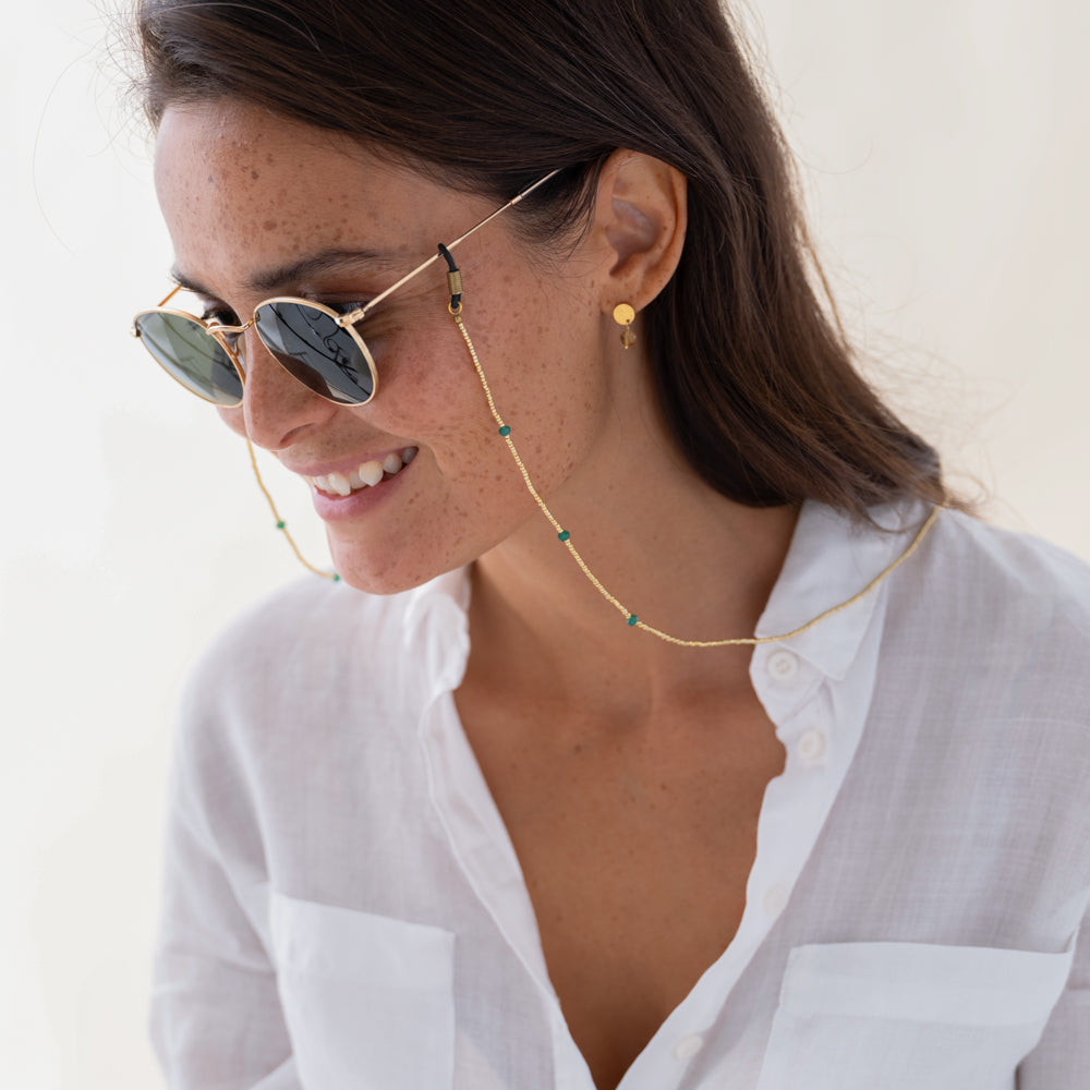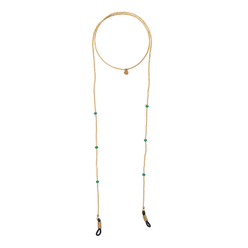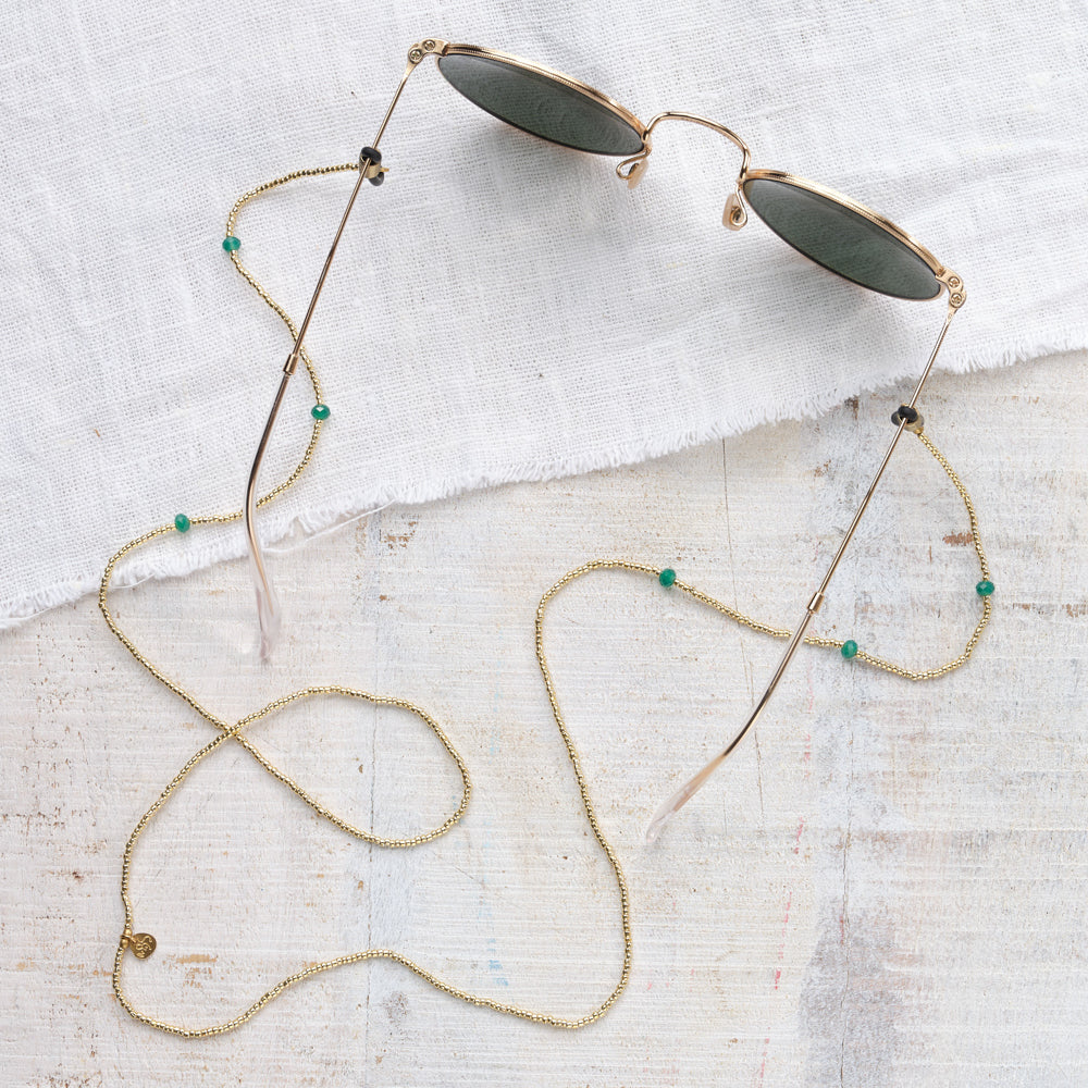 Ontdek het Shore Aventurijn Goudkleurige Brillenkoord van A Beautiful Story. Dit handgemaakte brillenkoord combineert glaskralen met zes kleine aventurijn edelstenen. De lengte is 74 centimeter met rubberen uiteinden. Dit accessoire is onmisbaar op een zonnige dag.